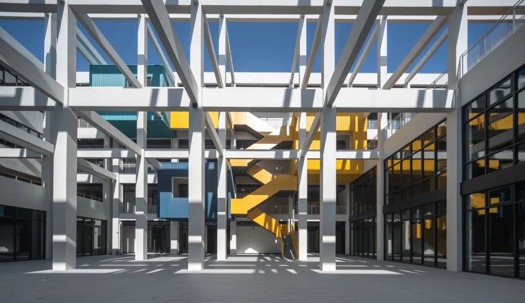 包豪斯理念首先体现在以CMYK印刷体系标准色彩来定义园区的不同区域;其次,在西侧主界面采用工业构成元素,利用大量的洞窗实现视线贯通,打破沉闷的厂房印象,加入科技感;第三,将最大的厂房中间挖空,暴露出多米诺体系框架,用色彩构成方式插入空间元素;第四,室内的门厅通过强化的可识别性设计,充分暴露出来;最后,包豪斯概念延续到VI设计上,与园区所针对的目标产业客户能形成一个共鸣。