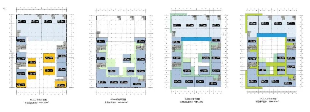 #102和#103两个厂房的设计方案经过了多轮修改。根据不同的需求定位和产品逻辑,厂房布局进行了多次的方案调整,从早期利用率最高的天井式标准办公划铺,到大中庭采光为核心的标准办公模式,最终确定采用“独栋+商业+标准办公+露台+连廊”的城市规划式模式。建筑方案一旦确认,景观和室内团队立即产生联动,进行各专业整合和深化。