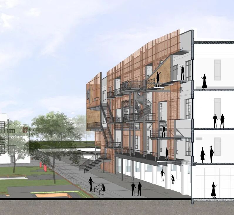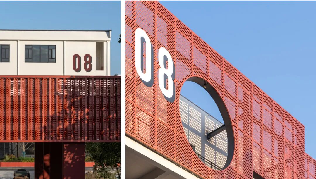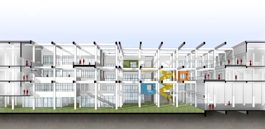 S这是设计伊始很关键的问题。如何在总体布局上与周边城市空间重新建立连接,这给设计带来了挑战。西侧沿沪闵路高架的长界面是基地与城市最重要的接口,也是园区最重要的形象展示面。西侧界面由厂房的山墙面构成,形成了独特的节奏,也为设计提供了契机。为了打破原有厂房印象,塑造一个创意园区的崭新面貌,我们将西侧界面多个厂房作为一个统一的整体界面来考虑,通过大大小小的开洞打破封闭的墙体,塑造现代、开放、活力的城市形象,也为高架桥视角提供了标识性展示。