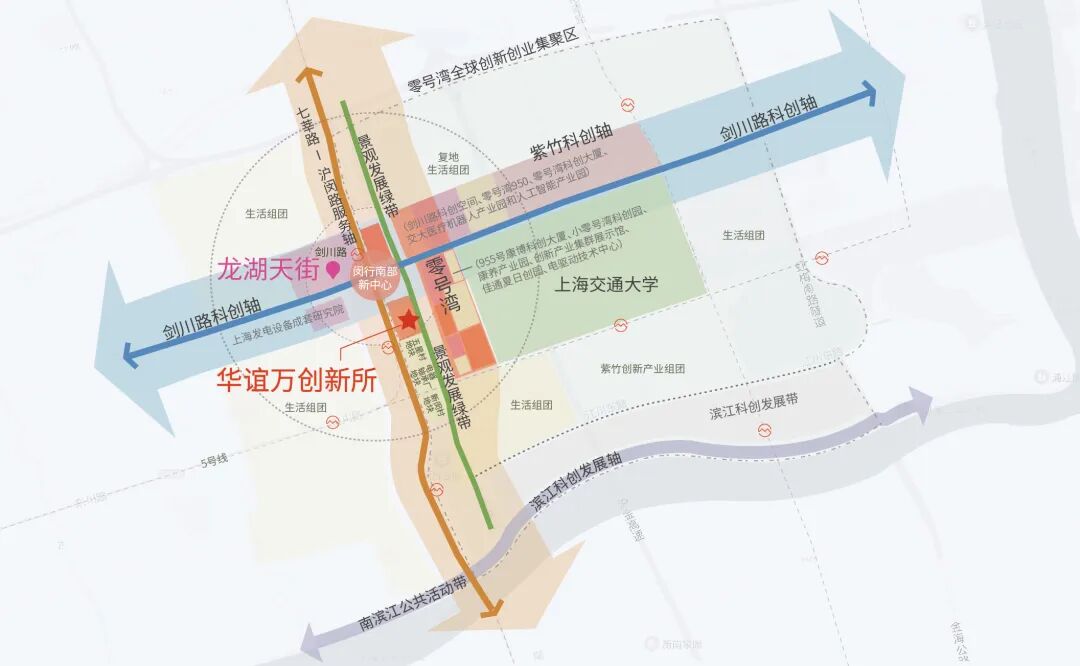 S : 闵行区总体以四大版块构成,华谊万创·新所项目所在的南部版块是科技创新核心区,科研机构、高等院校集聚。依托快轨为区域导入人流,区域内既有的零号湾最早承载了交大的功能溢出,随着城市区域价值的发展,存量空间土地价值需要进一步释放。