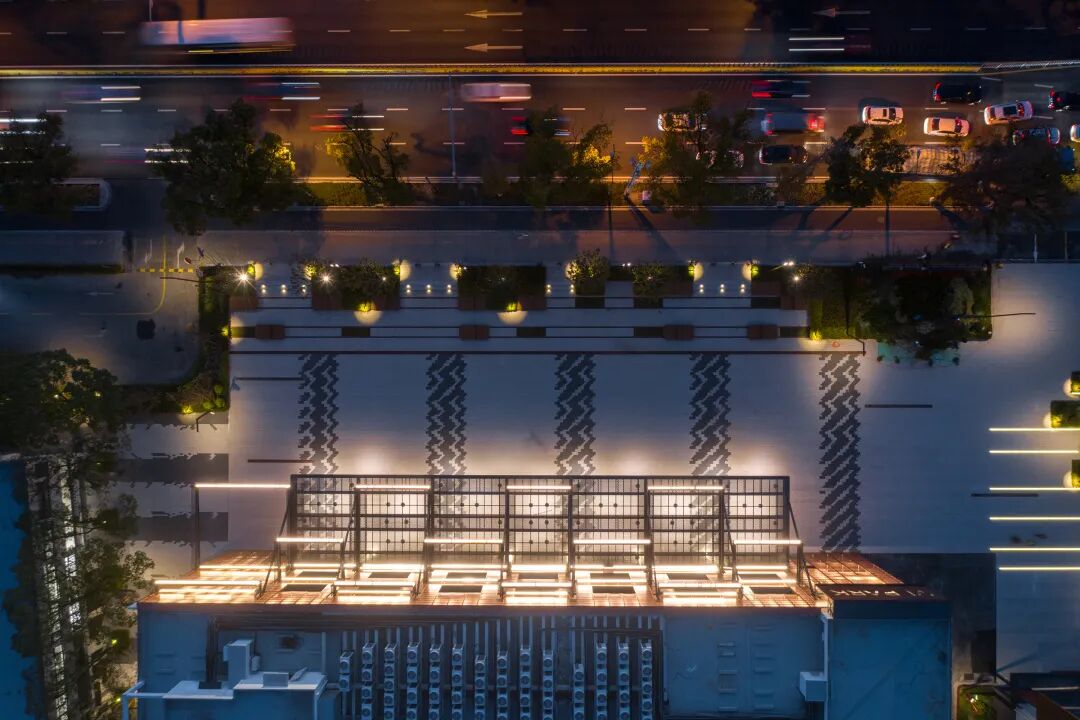 2017年设计的华谊万创·新所与2015年设计的闵行龙湖天街、剑川路地铁站改造形成了联动的区域城市更新组团。这几个项目的陆续完成,实现了以大城市骨干交通为依托的产城融合。剑川路地铁站的扩容改造保障了人流的导入,增强轨交和周围城市地块的联动;龙湖天街以地产开发的模式,实现了大型商业设施、多类型总部办公组团,以及体育运动空间的互动,容纳交大产业链条里面的上下游企业;而华谊万创·新所的改造实现了低价值属性的产业空间向高价值维度的城市复合空间的转换,提升产业空间增量的同时丰富了空间环境品质和文化属性,从而增强了产业和城市之间的黏性。两个项目定位不同,形成互补,并在南北向形成了以TOD模式的城市发展轴,实现了以产业转型为核心带动闵行区城市发展的目标。