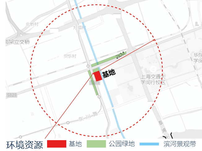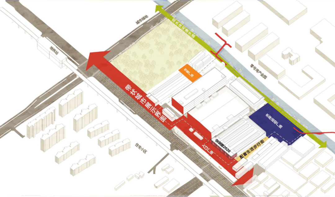 基地与周围的城市空间有些脱节,东西向被轻轨和横泾港所割裂,南北向的接壤条件也不太好,在更新策略中如何与城市空间建立联系?