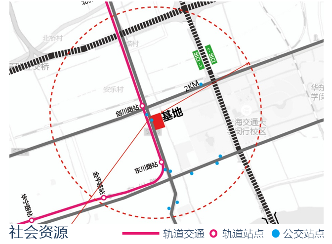 从空间上来看,橡胶厂位于以沪闵路和剑川路为纵横轴的十字节点,十字轴向南延伸到闵行滨江科创发展带,东西向串联起交通大学、零号湾以及闵行龙湖天街、剑川路地铁站等几个重要节点,形成了以科创产业为主体,居住配套、交通配套于一体的大型城市更新片区。