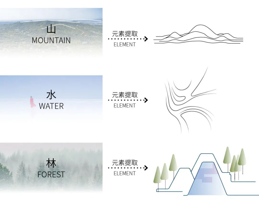 项目从山、水、林这些自然元素中提取专属的设计符号,融入景观之中,使其既有山水自然的神韵,又有文化的传承。