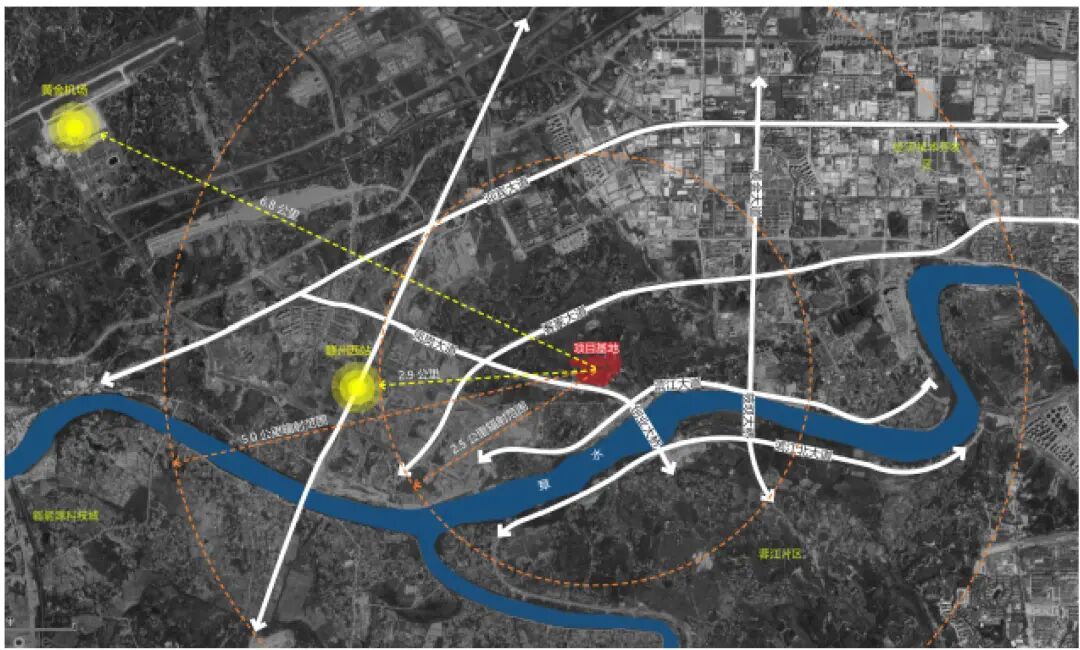 项目到赣州西站的直线距离约2.9公里,到黄金机场的直线距离约 6.8公里,对外区位优势显著。同时项目场地南临章水,东侧、南侧与西侧均为公园绿地,环境优越,自然景观资源丰富。