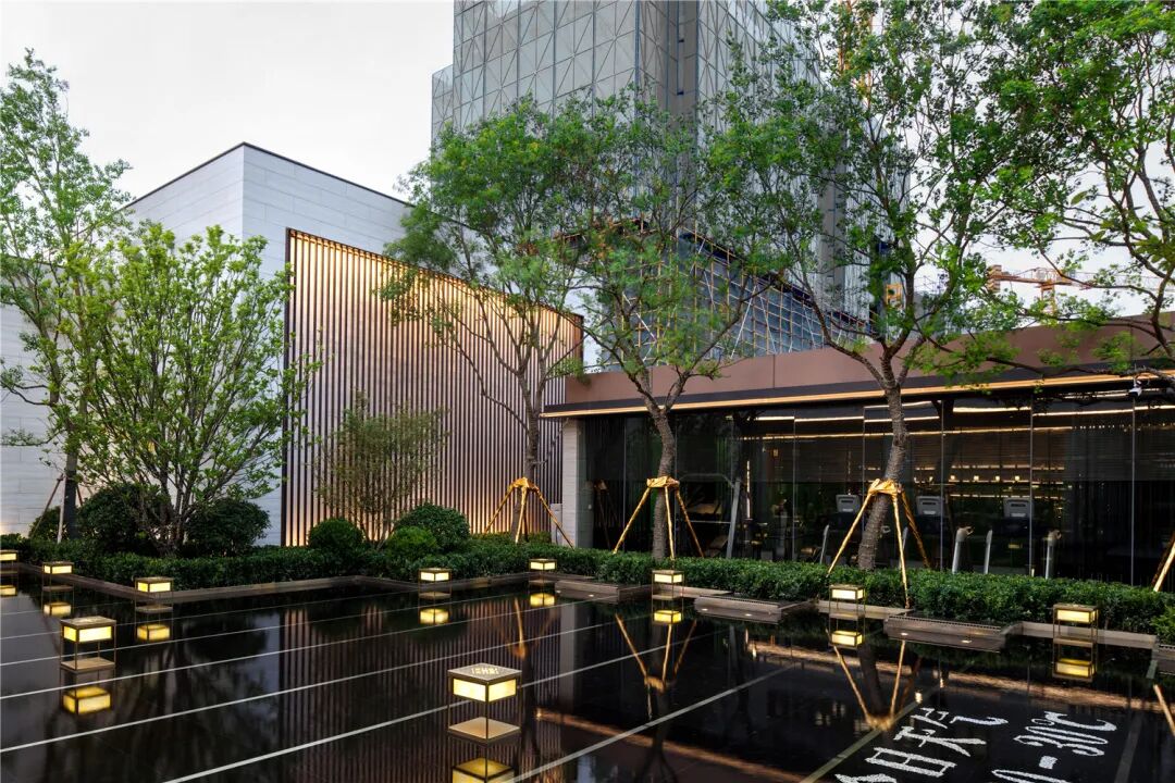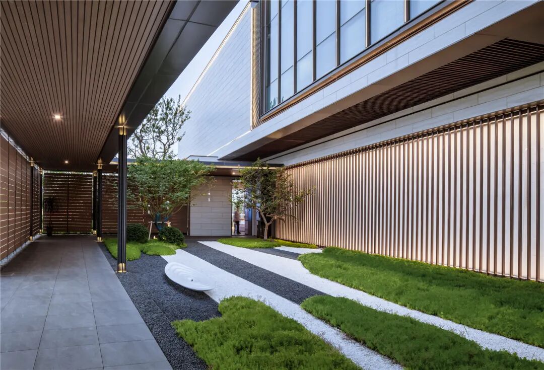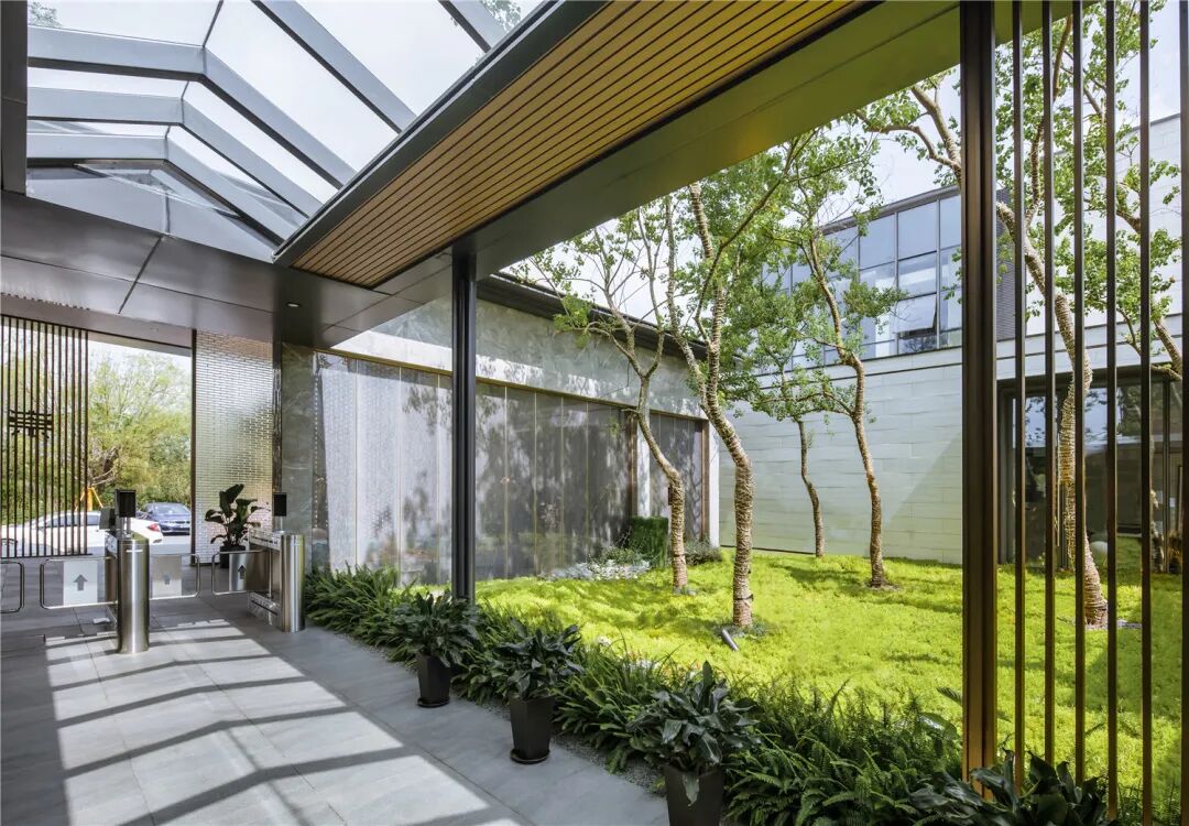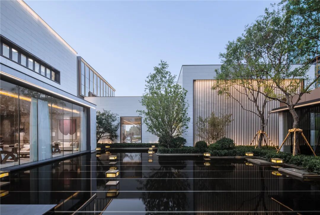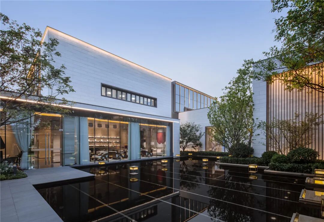 内院建筑呈围合之势与一方池水共同营造私密宁静的归属空间。一层大面超白玻璃模糊了室内与室外的边界,空间界面的隐退,建筑与自然相互渗透,强化了人与自然的互动体验。