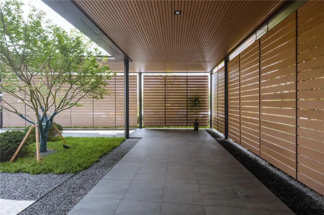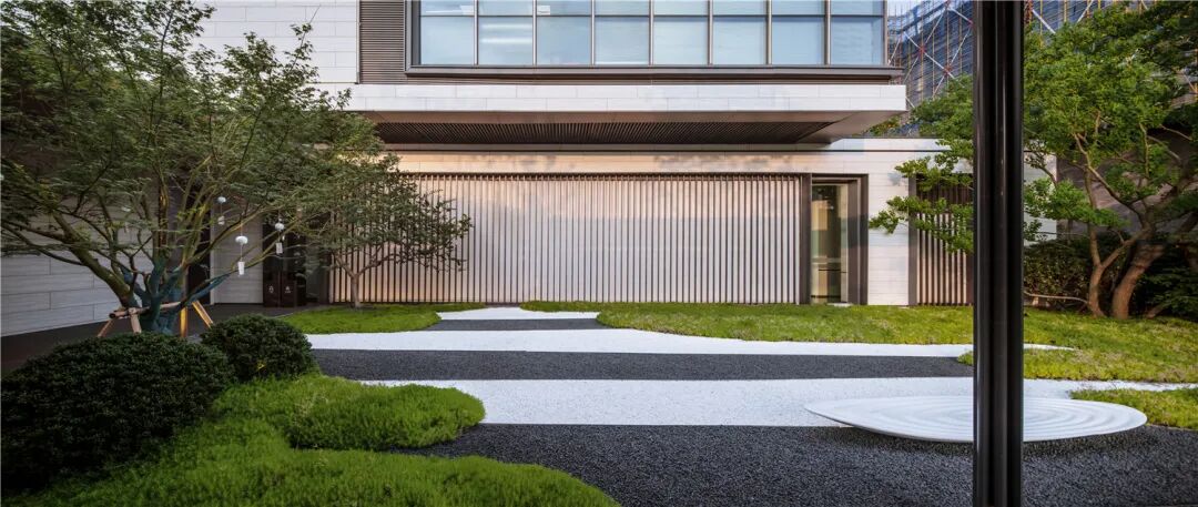 横向飘檐和层层错叠的片墙,搭配铜色格栅、独特雕塑极简的设计,形成独特而富有昭示性入口,有趣的是通过雕塑的引导把车行与人行完全分开了,向右是车行及下地库的入口,向左是富有诗意的“安心客厅”。