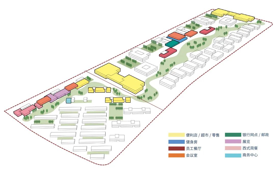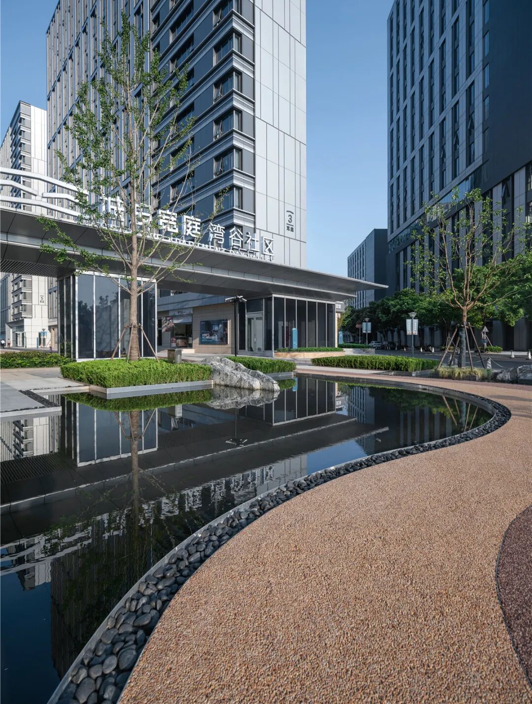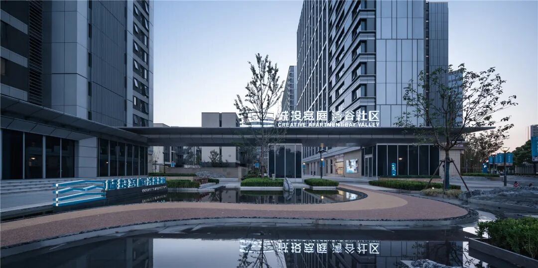 湾谷一期园区内配套与中央景观有机结合,形成中央商务休闲服务区。基于对公共空间的关注,项目团队希望社区变得“透气”而非“封闭”,与外部具有充分的联系。