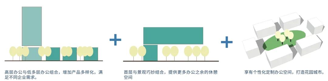 针对客户需求,将打造三栋大型生态智能化办公楼。它能满足大型企业对办公空间设计需求、企业硬件配套需求等企业个性化需求。工作状态时常是聚焦和紧张的,融入了社交及休闲空间可使员工暂时脱离紧绷的状态,反过来促进创造力的发挥。
