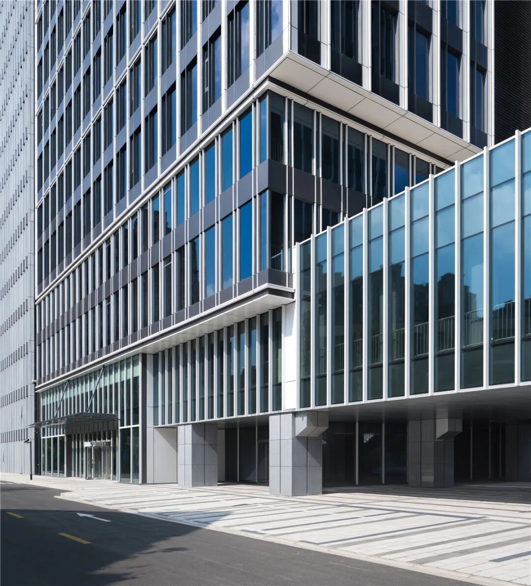 立面控制强调精细化和颗粒度控制,以智能化办公为例,裙房部分主要采用幕墙体系做法,通过不同形式的幕墙排布呈现立面的韵律与变化塔楼采用幕墙与类幕墙的体系,通过对金属线条,细部颜色的形式控制,呈现办公立面的挺拔效果。