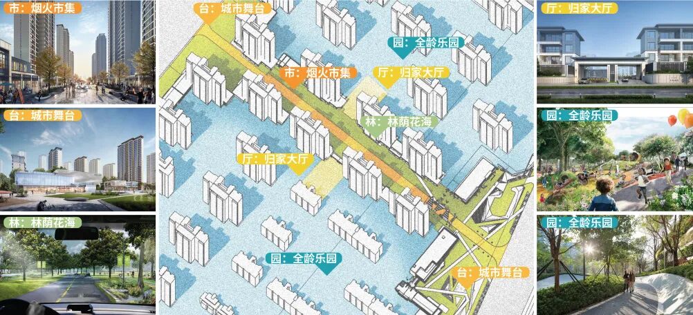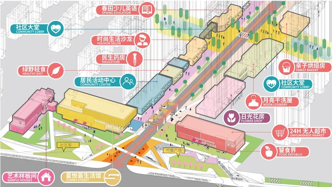 示范区作为进入整个项目的开篇,承载了以人们的生活体验为主体,链接城市与社区,创造聚合活力、开放共享的全龄舞台。