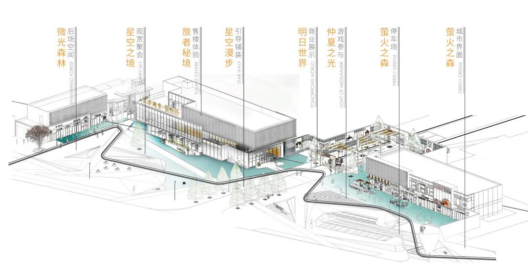 示范区的整体规划以“星宸之旅”为主题,带领人们进入一段萤火虫引领的星宸梦境。人们游览路径与目光追随着萤火,落在示范区建筑构建的一个个精美的礼盒上。