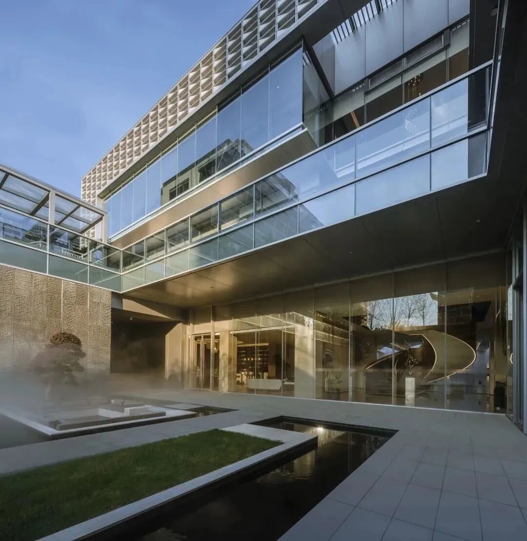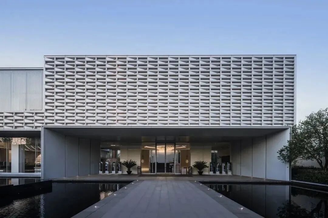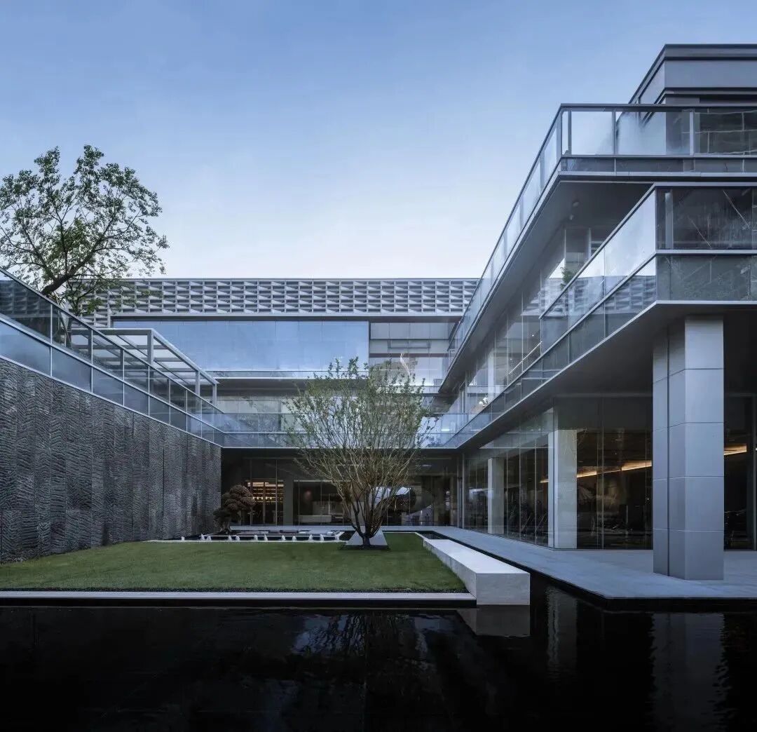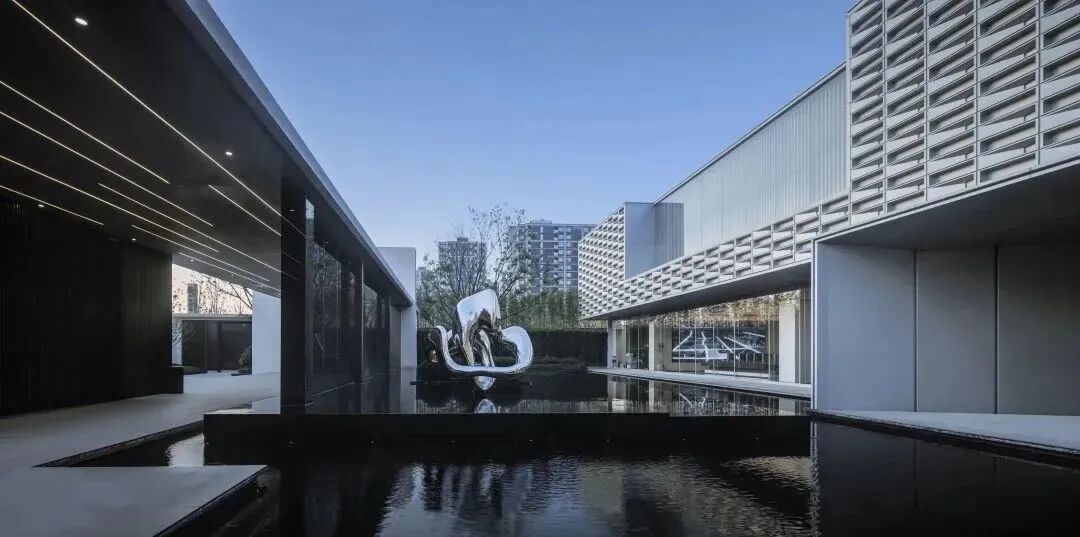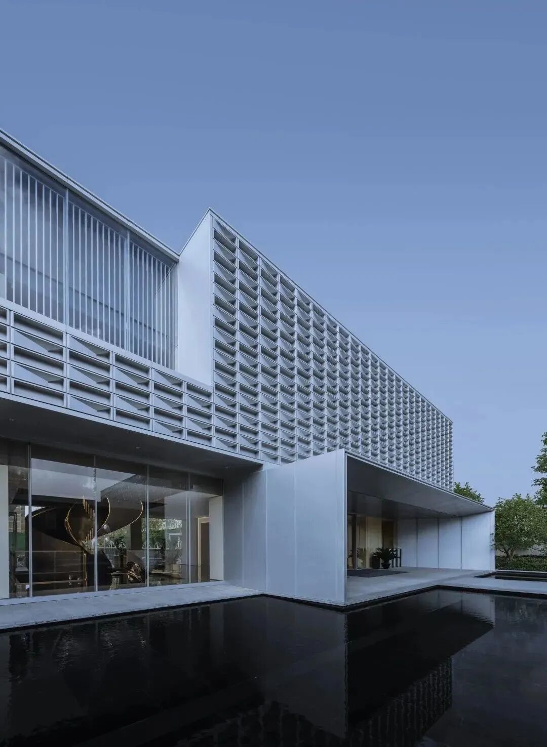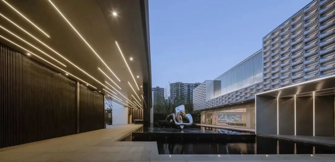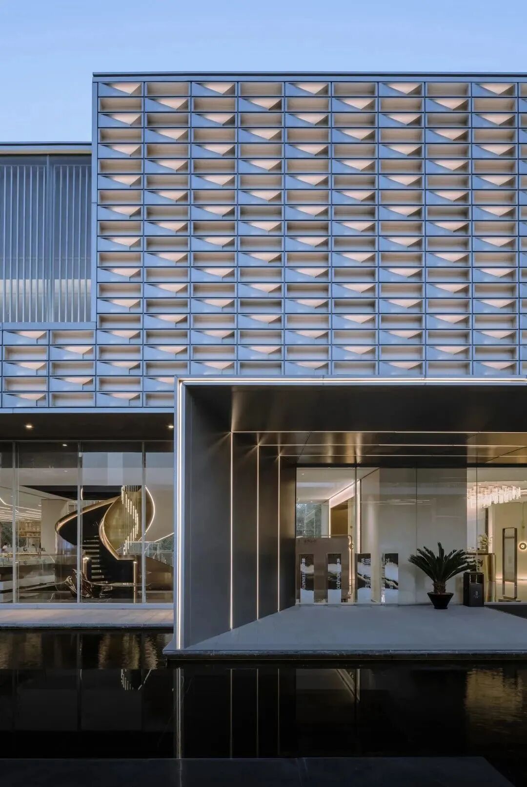 穿越入口转折门廊,序列铝板单元映入视野,水景自入口延续至内庭院,风帘翠幕,菱歌泛夜;两种形式的单元阵列给人以秩序感之美,入口的斜面形式,以迎接的姿态等候来访者。