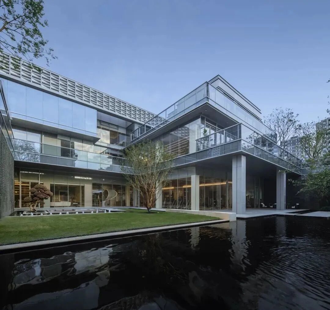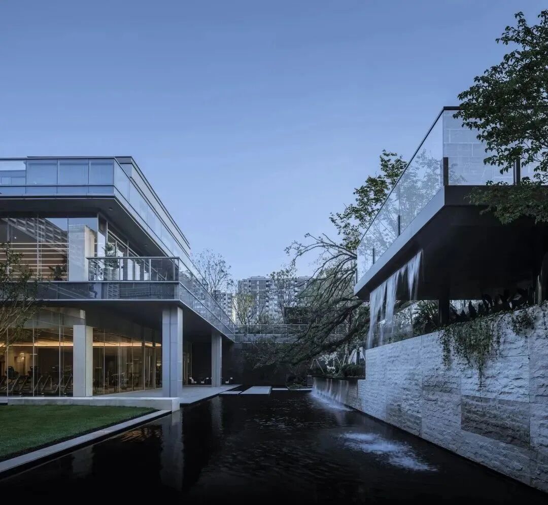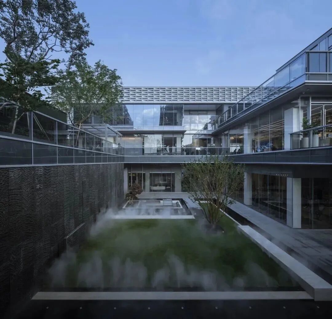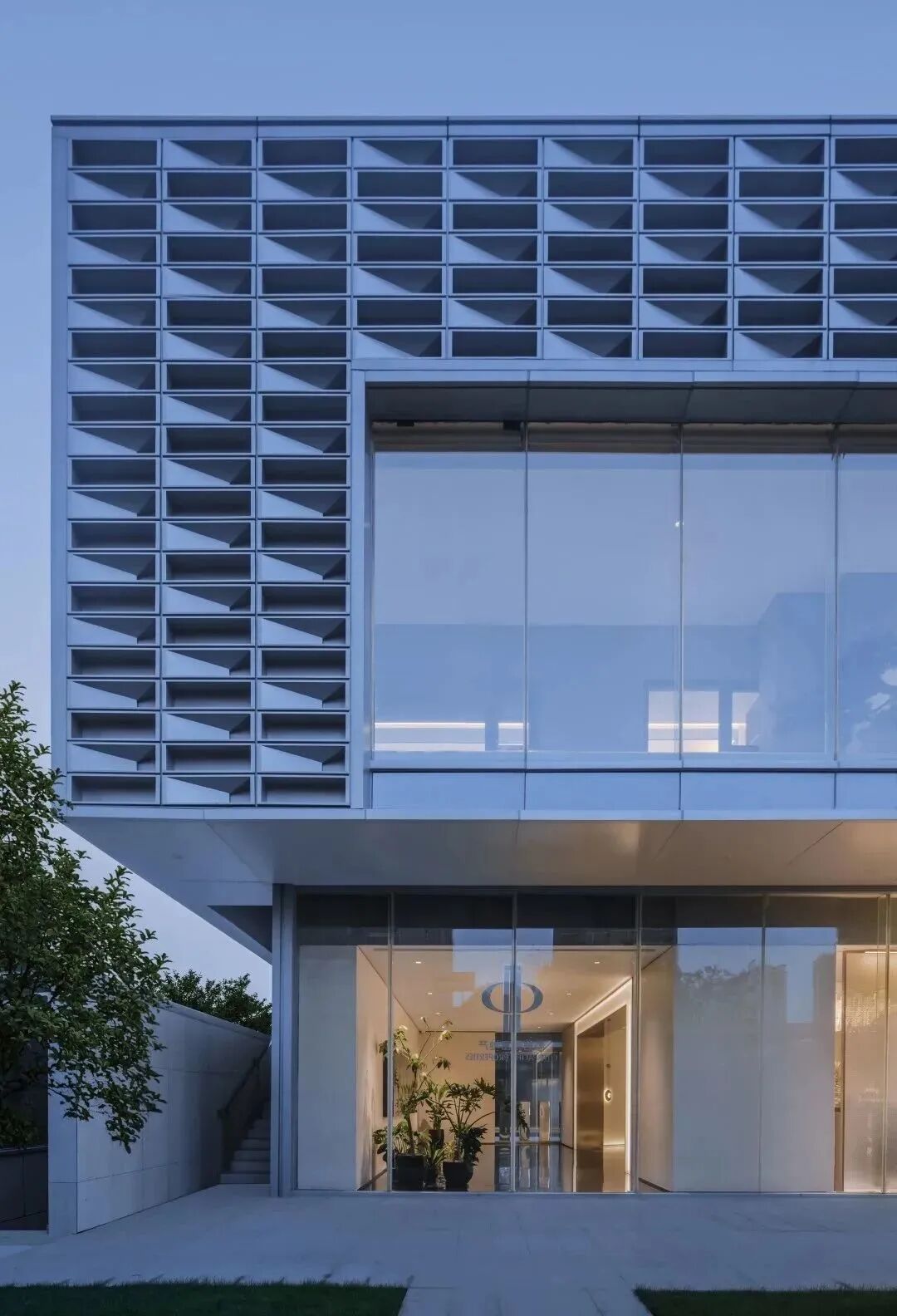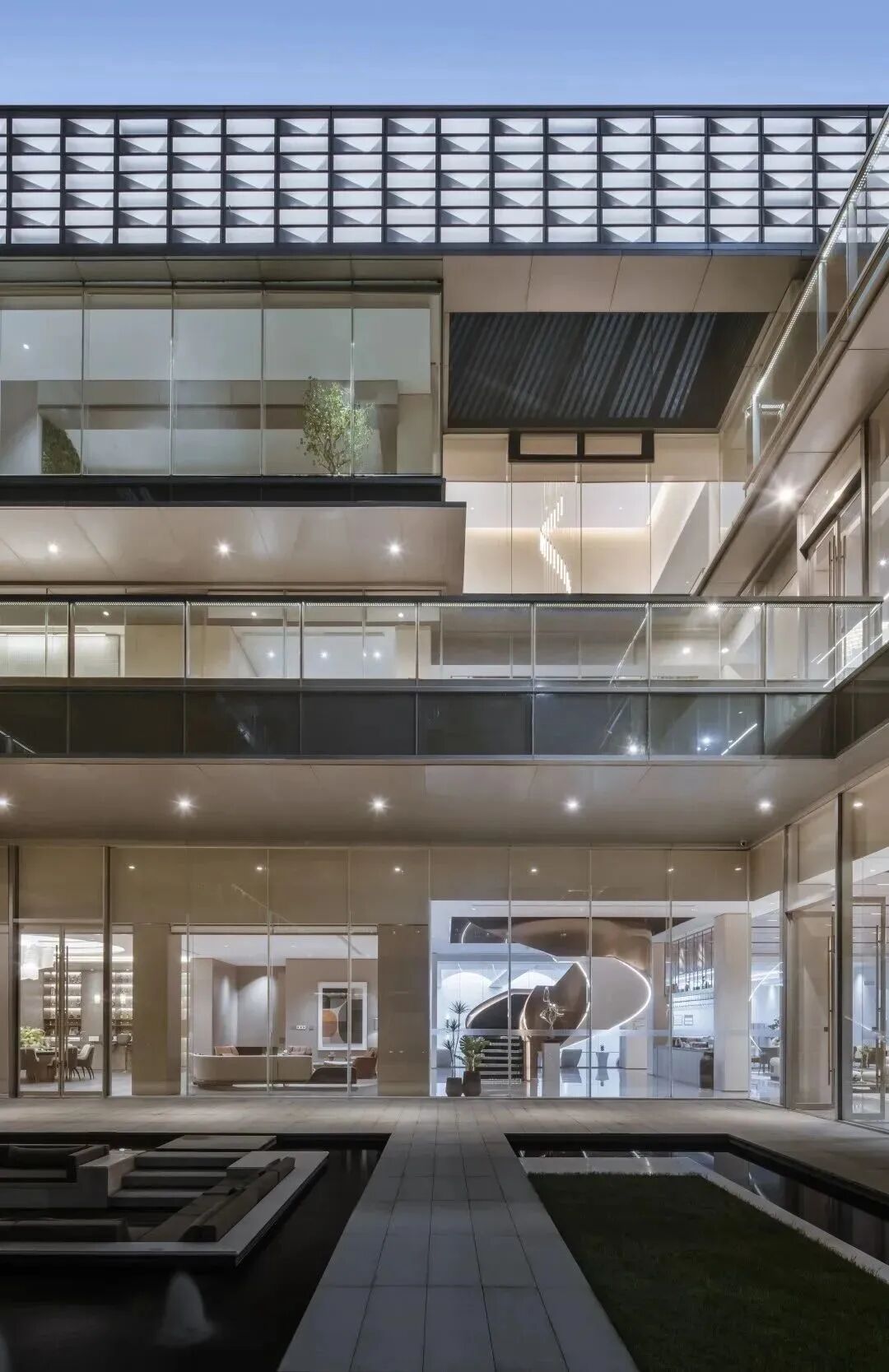 穿越入口转折门廊,序列铝板单元映入视野,水景自入口延续至内庭院,风帘翠幕,菱歌泛夜;两种形式的单元阵列给人以秩序感之美,入口的斜面形式,以迎接的姿态等候来访者。
