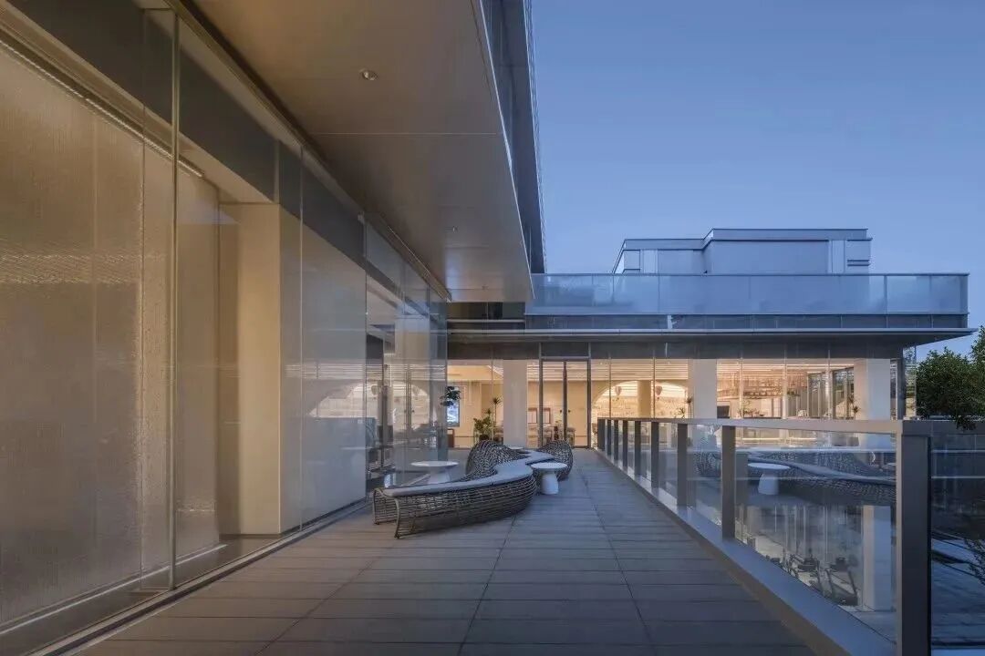 一层、二层前期作为售楼部接待,后期为物业用房,承载快递收发、物业服务等便民服务功能;地下一层为健身会所、恒温泳池、瑜伽房与私宴厅,直通下沉庭院,L型布局最大程度将室内与室外景观相融合;每层均有室外露台空间,层层错动,优享闲适,与景观活泼对话。