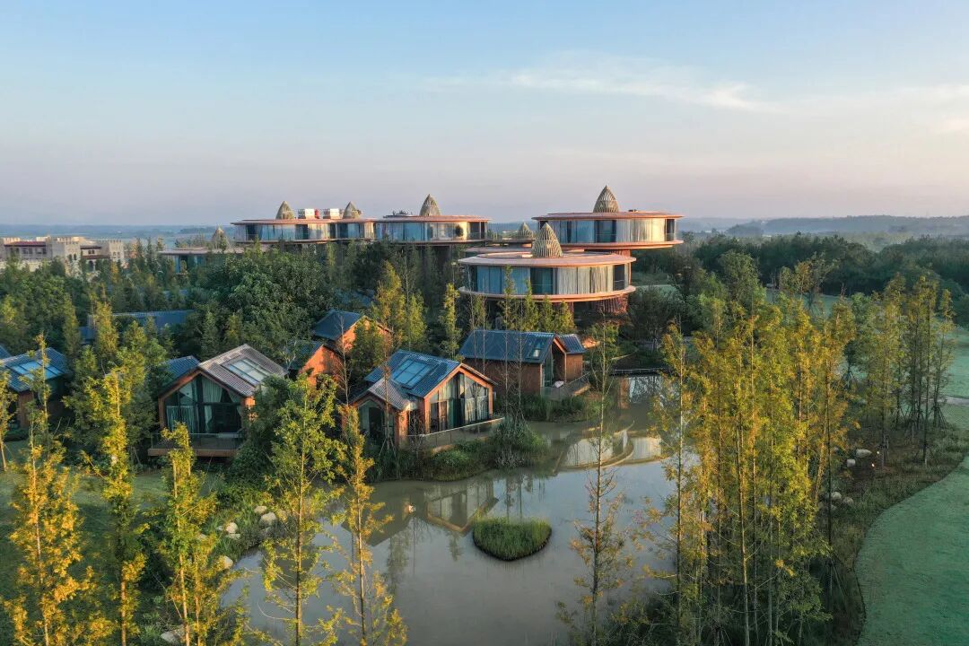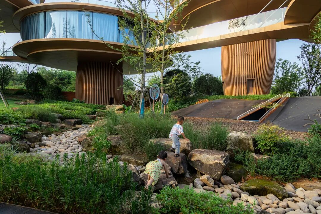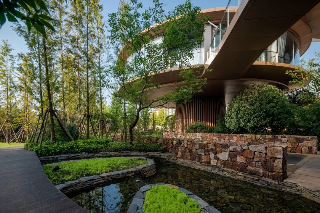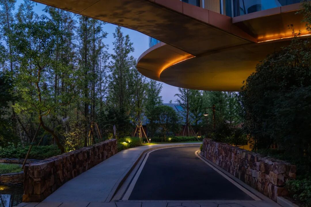 酒店坐落在南昌绿地安南小镇内,以第四纪网纹红土公园为周边背景,三面公园所围合,一面面向道路。我们希望酒店以自然生长的方式呈现,仿佛是从大地中生长出来,融入这片的红土地貌和原生植被群落中。