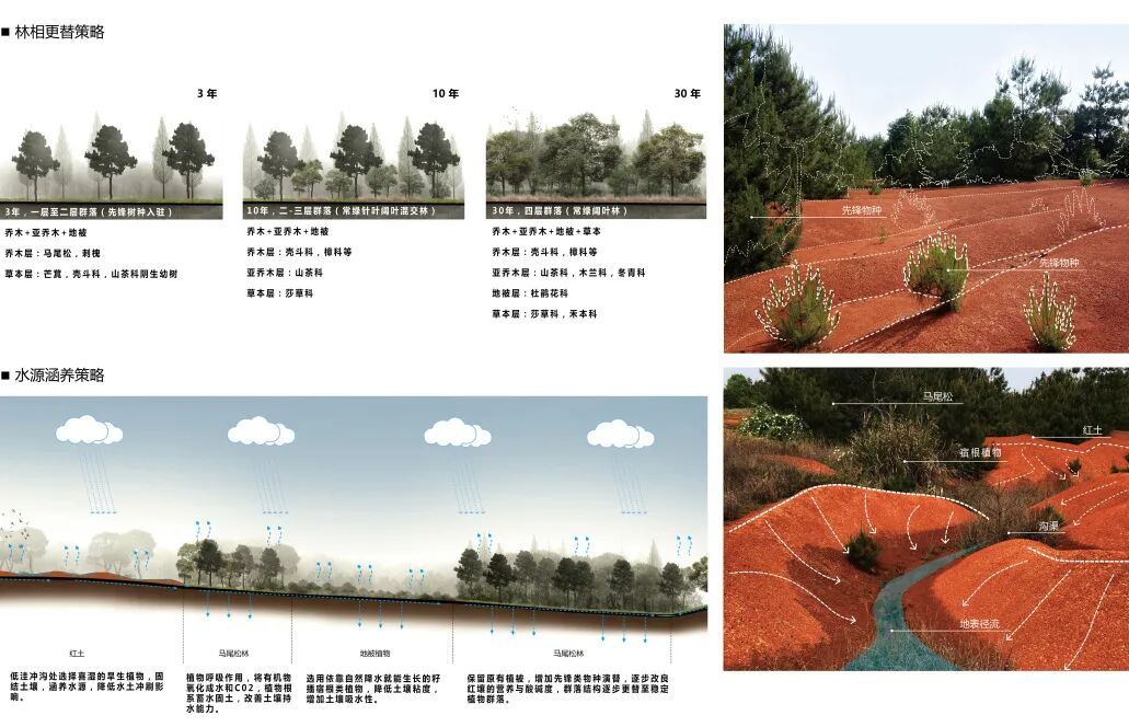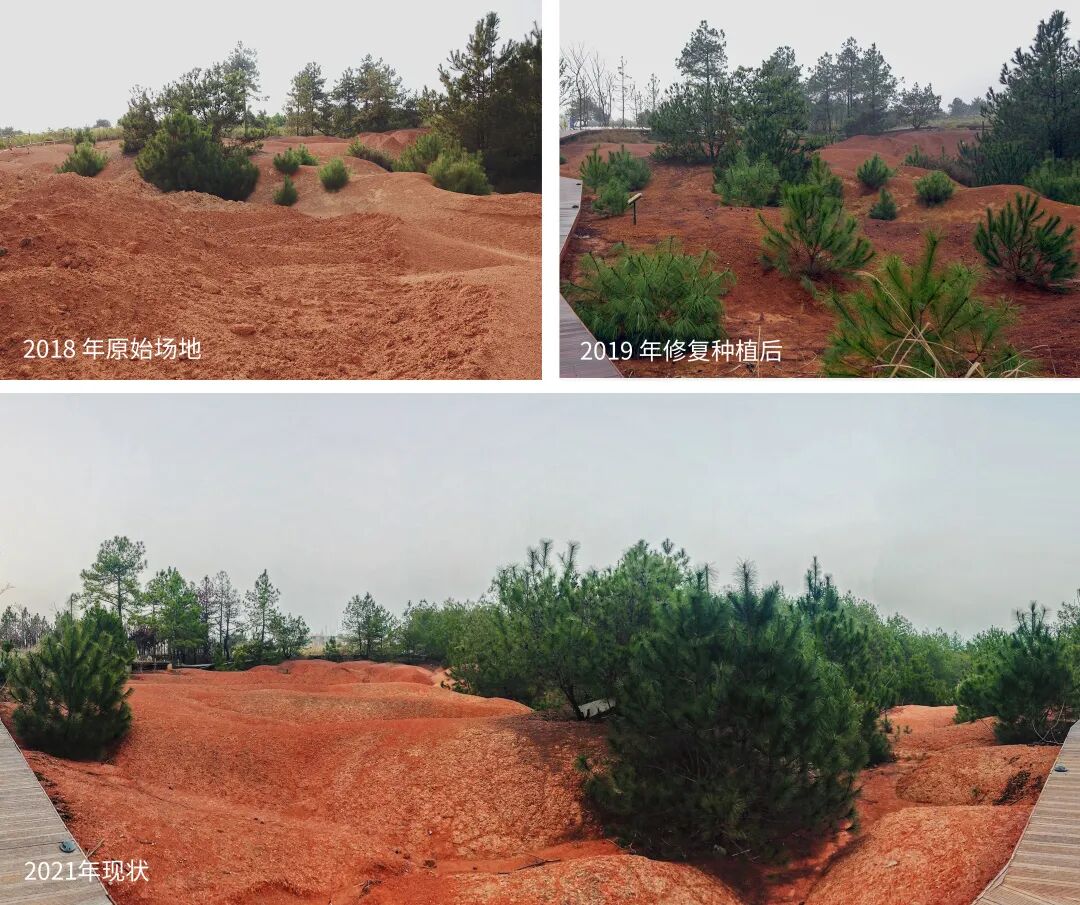 在红土公园设计之初,我们对场地提出林相更替和水源涵养的生态策略,并且对场地进行局部修复和先锋植物的种植。景观近三年的生长,我们欣喜的看到植物在红土中深根生长,固结土壤,保持水土,上演了优胜劣汰、物竞天择的自然规律。