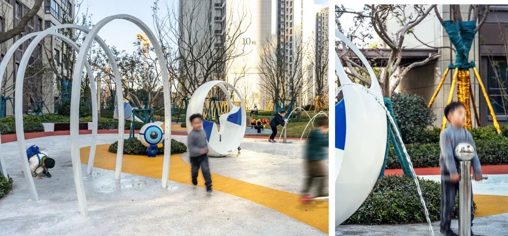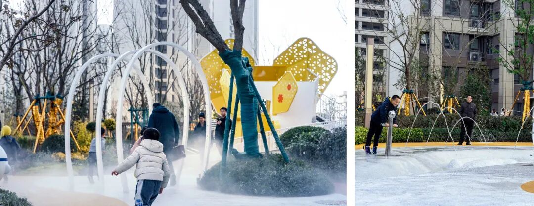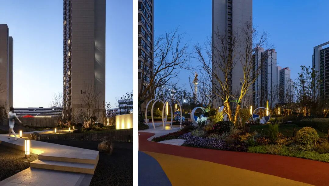 在社区内的植物配置,结合不同景观空间使用户外空间过渡与人的活动行为的多样性而产生的层次变化。植物配做符合场地高差要求的微弱变化外搭配不同的植物依旧保持着每个季节的特点,在四季的交替中依然有这三季的花、四季的绿色。