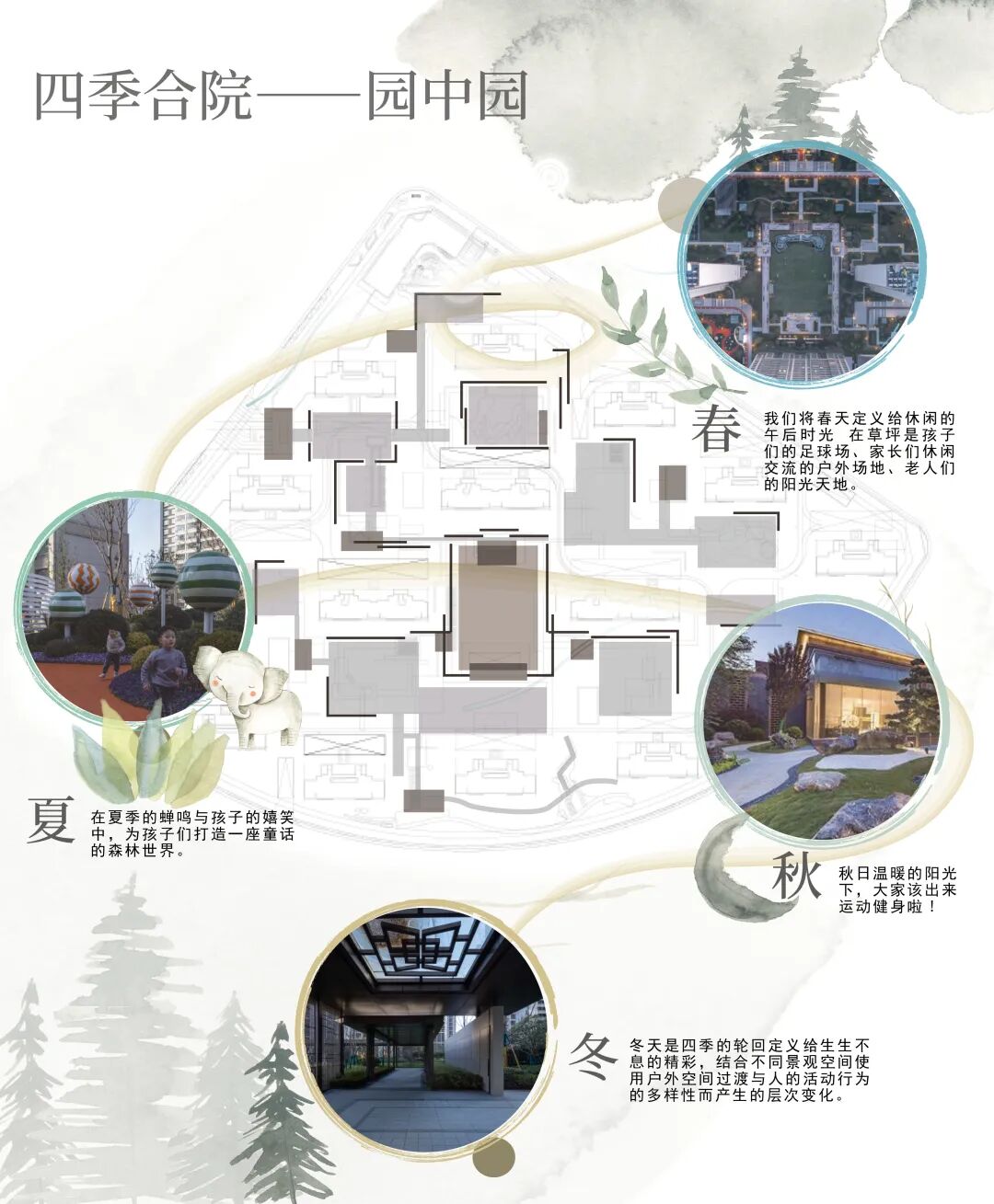 风华国际的景观概念来源于曹仁容《苏州园林名胜》中合院设计为原型的四季,通过行云流水般的景观种植和水景依次串联。将四季变化的自然之境与场地之内的景观相结合,以一年四季的不同特征定义场地景观的不同功能,以轴线延伸的景致依次展开,动线与体验重合,人的活动过程也是风景的一部分。