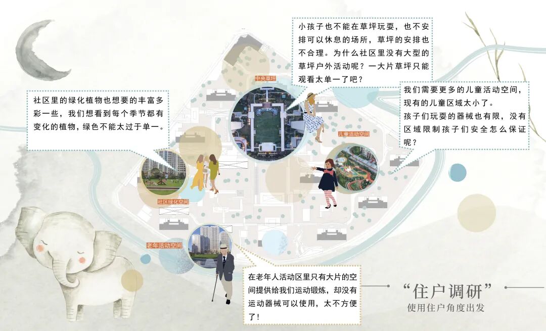 我们分析居住人群,参考使用者的需求建议作为功能依据,在使用者的角度上丰富功能的合理性,同时丰富景观绿化的多样性,增强人与景观的互动性,促进社区居民间的沟通与交流,并在此基础上增加场地特色,将四季变化与场地串联。