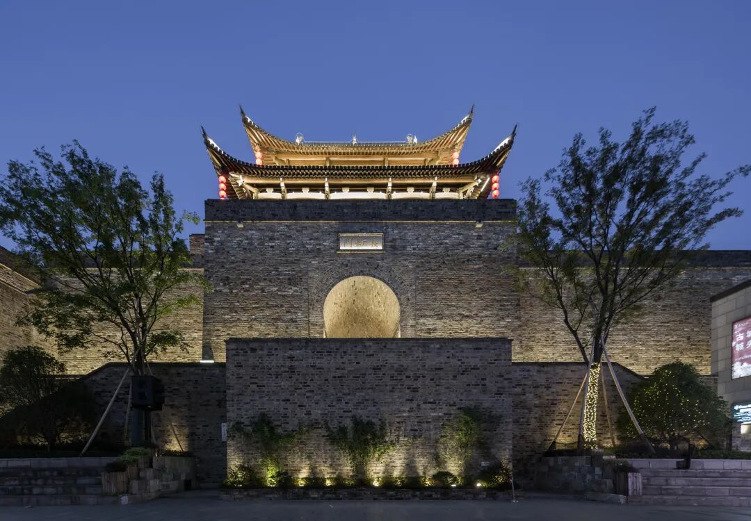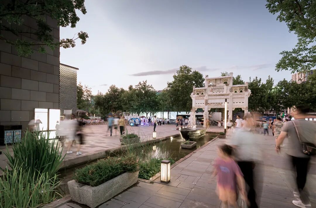 气势恢弘的长虹门是古城内标志性建筑。我们利用场地的高差以及与周边建筑的围合关系设计了台阶旱喷等装置,打造一处小型的城市广场,与艺术家合作进行公共艺术分享,交流文化。