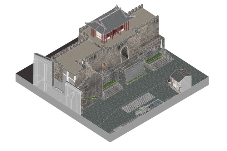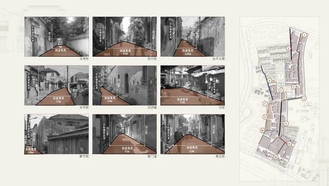 古城遗存着数十条尺度规模不同的街巷,仍保持着明清时期的整体格局,保留着传统的商业风貌。贸然的改变街道尺度及走向必然会影响整体古城的格局布置。为此我们考证了历史并结合交通流线及周边业态,使每个新的设计元素恰到好处的存在于整个历史空间的叙事中,并满足不同街巷空间的需求。通过为还原历史和塑造新的活动空间,使人们可以更好的享受场地,并感受场地内的文化脉络。