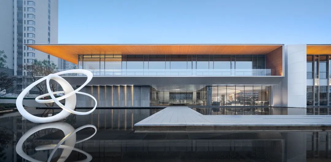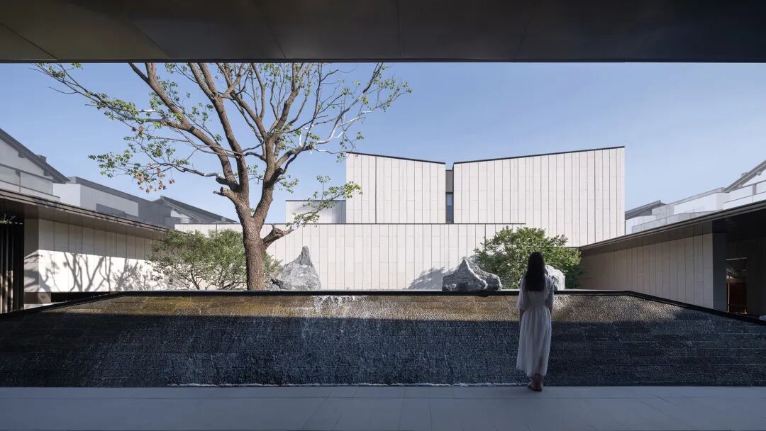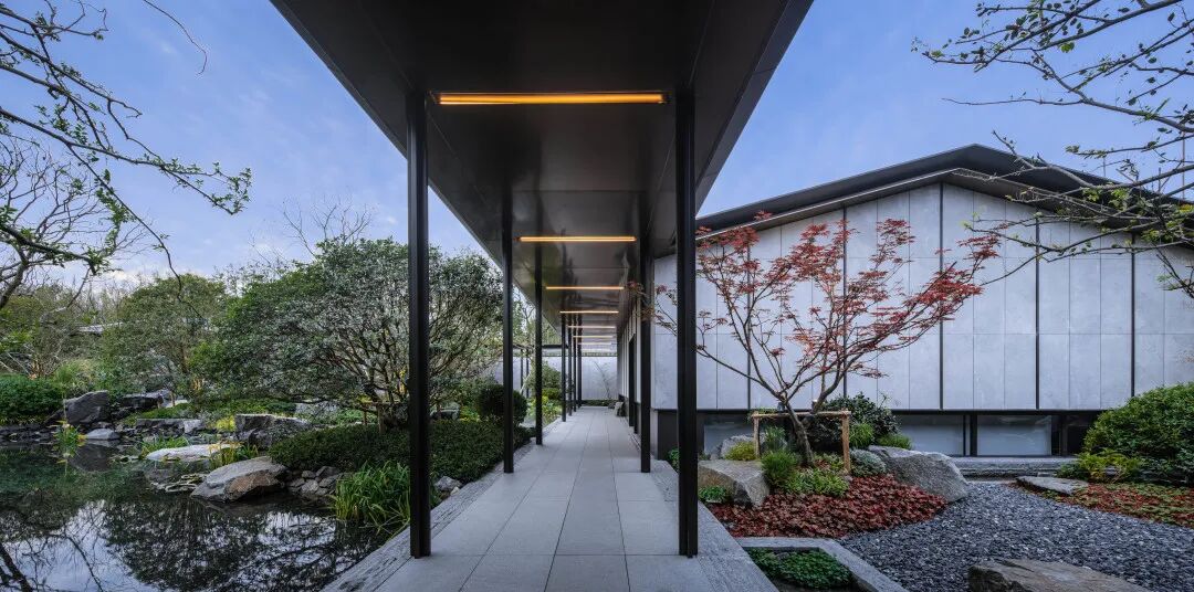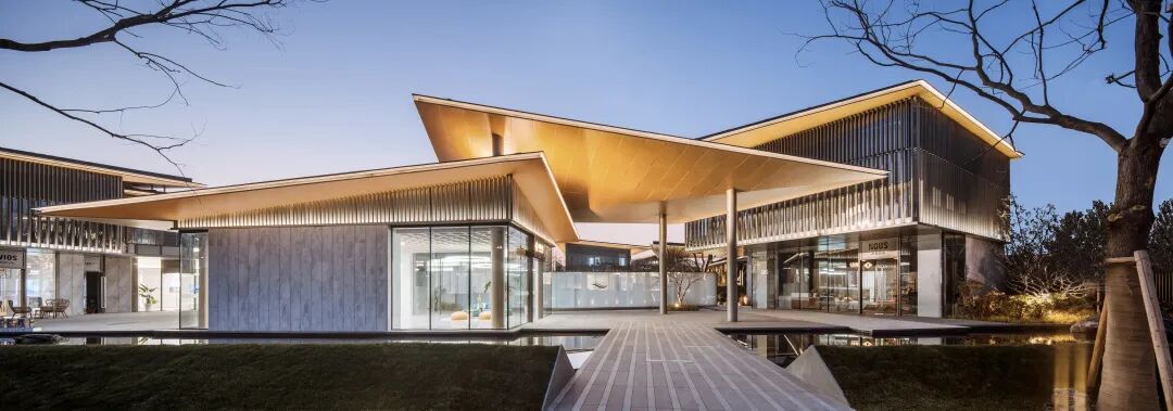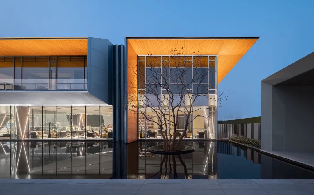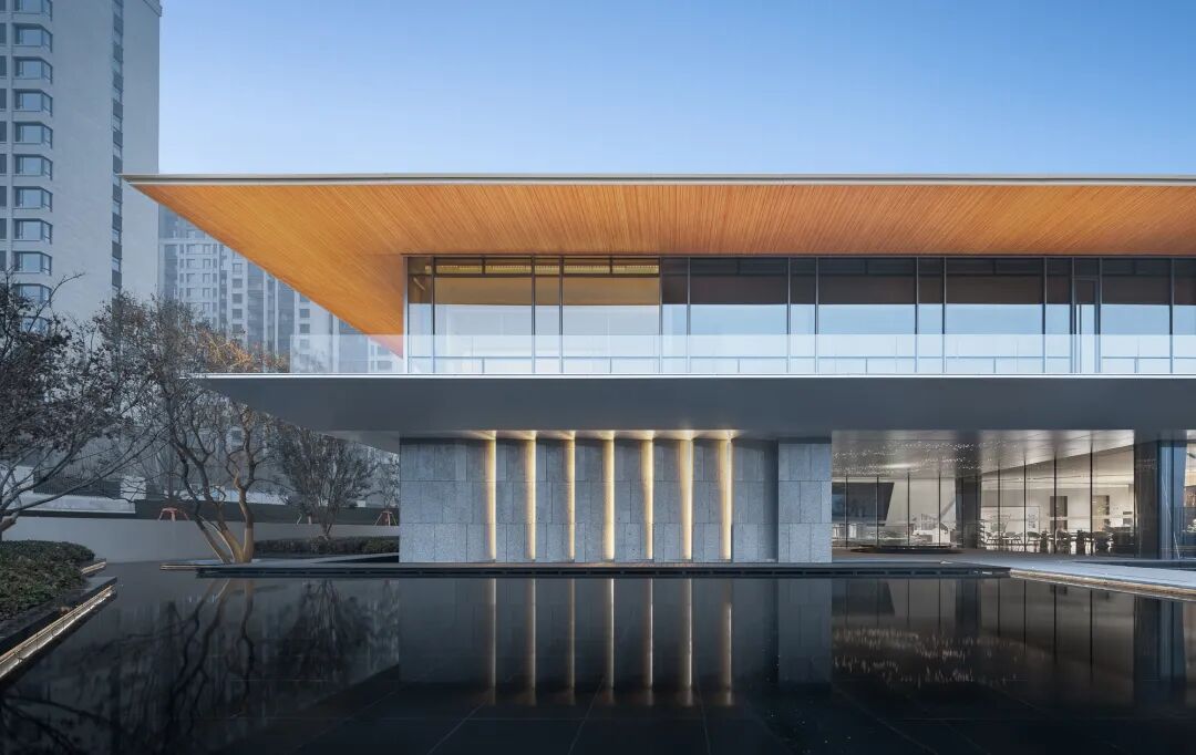 设计汲取古典设计美学,将中国传统繁复的建筑构造,简化为玻璃幕墙、石材基座以及铝板挑檐等更加简洁的形式以符合现代人的审美。视觉上强调屋顶的体量感以及檐下室内外空间延续的整体感,通透的玻璃幕墙替代传统墙体,构建了无缝景观。建筑入口处精心构建的灰空间,模糊了建筑空间与景观的界限,屋顶星空灯更增添了空间的趣味性。