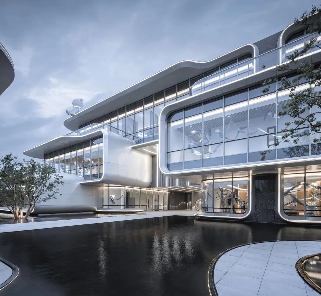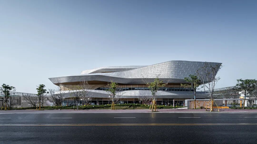 整个展示区以无限符号为线索,贯穿整个设计过程,通过对蝴蝶与无线的提取并组合形成建筑表皮。建筑外置大线条穿孔铝板,在夜间,灯光亮起,透出星光点点的光线,犹如静谧夜空中的漫天繁星。延伸到立面的部分,让同一种设计语言在整栋完美融合。置身光点之下,仿佛遨游星辰大海,给人带去期盼,温润城市中每一个灵魂。