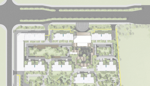 本案位于德州经开区中心地段,紧邻市政府旁,营销中心择址六号线道路中央,是目前唯一建好的可开口道路,以及考虑到车行流线、人行流线,结合场地现状,最终我们将示范区规划于此。在广川大道(市区主要人流来源)和六号线道路交叉口设置连续招牌,可取得最大昭示性。以及能够更好的与城市呼应,同时也借助了城市道路绿带,形成良好的市政界面。