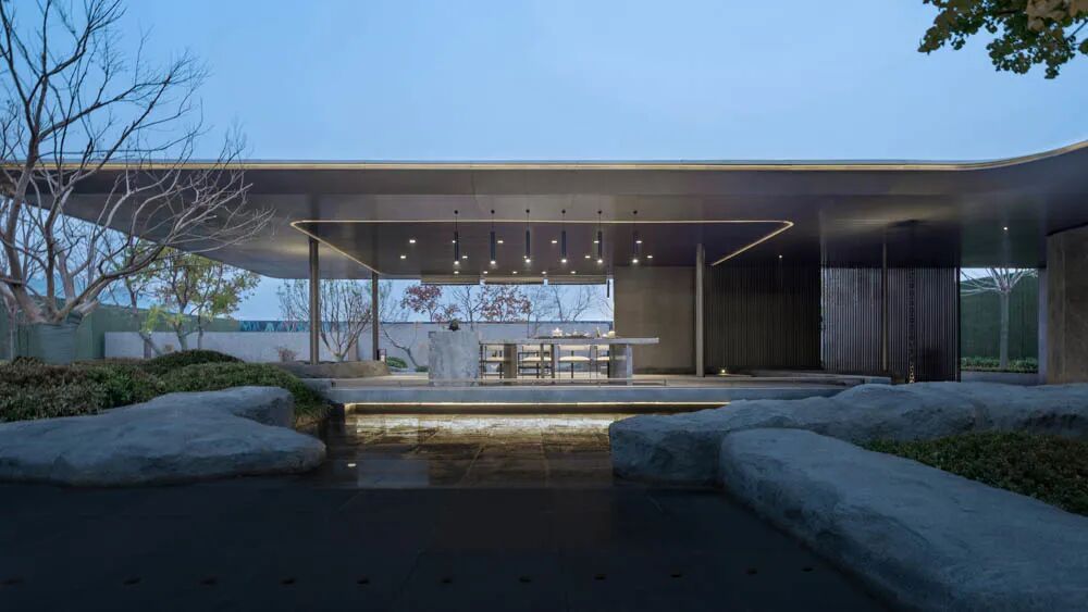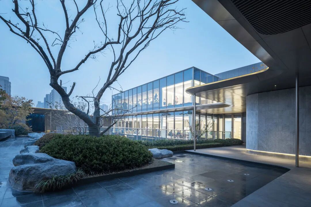 镜水延伸至连廊边沿,以黑金花岗岩和金属包边,弱化与地面的边界感,使得建筑、景观、室内相互连接,产生独属于场地的灵动感受。