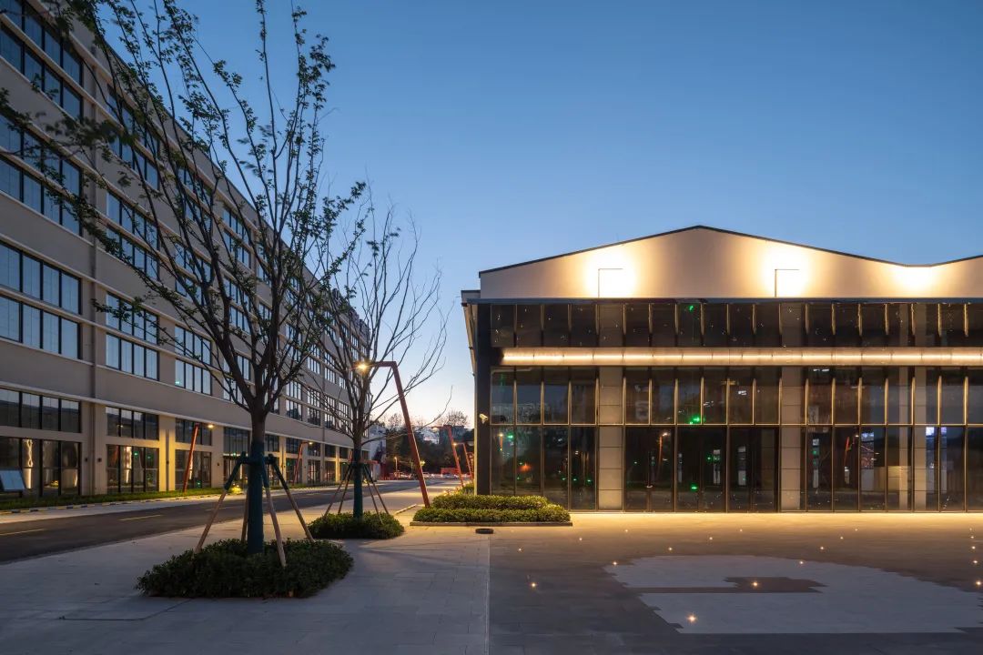 #302组合对面的#105路演广场是整体规划中承担各类厂区活动的综合性节点之一,设计保留了原有广场的尺度,而面对广场的#105东立面则采用全玻璃折叠推拉门形式,配合5m出挑的镜面不锈钢雨棚,在有演出或活动举办时,室内外空间可以做到互相连通。
