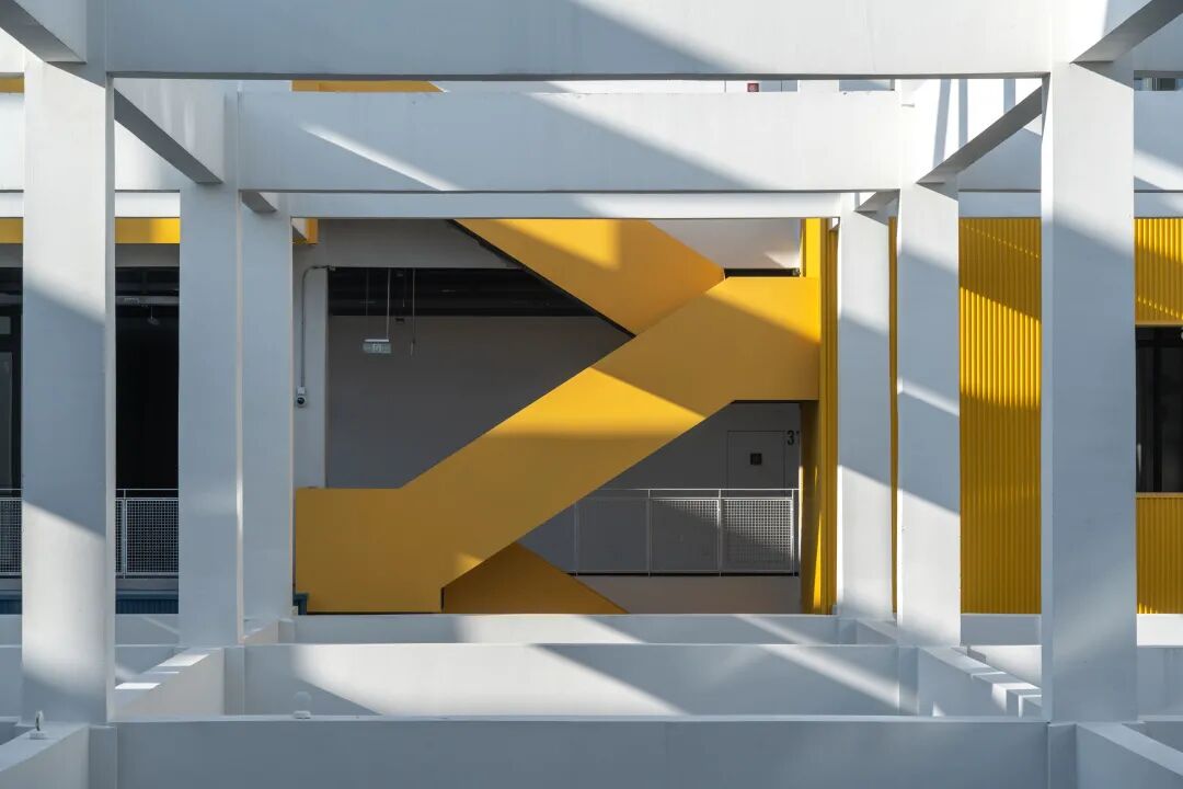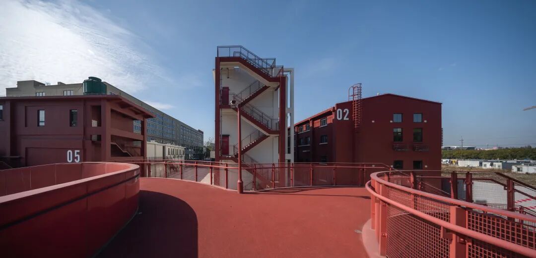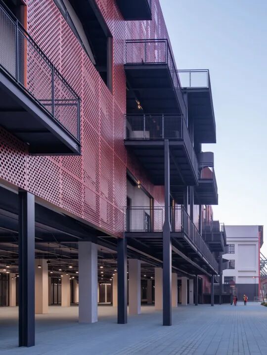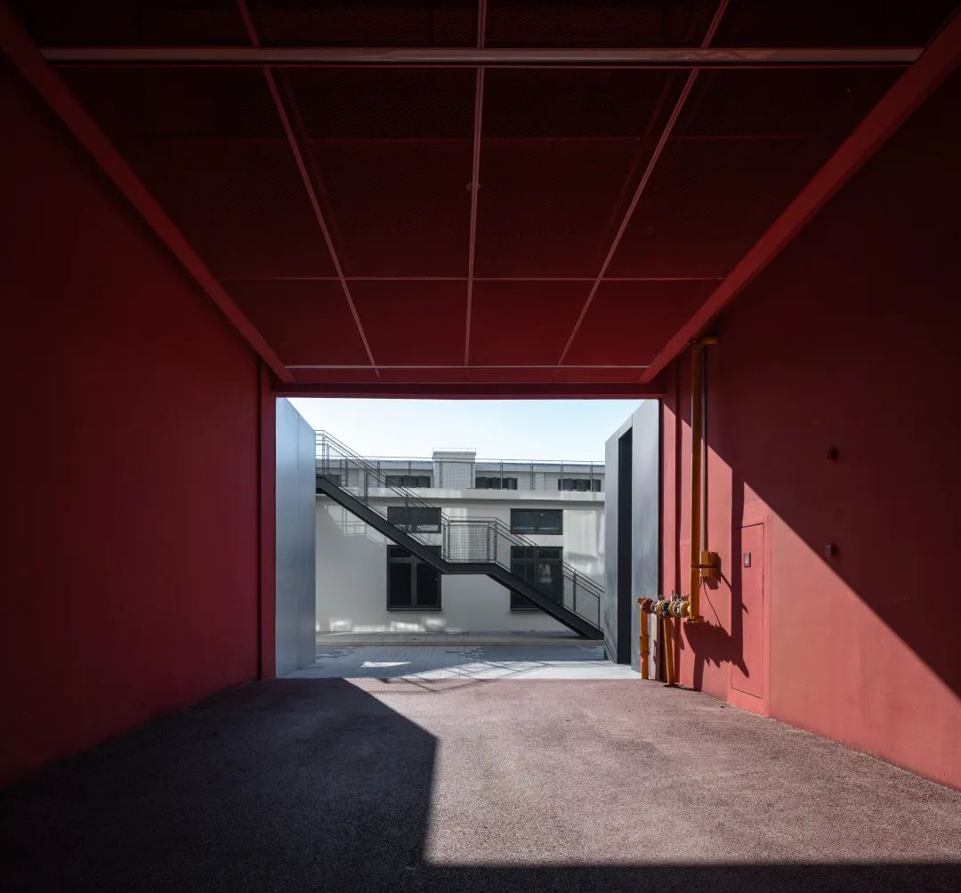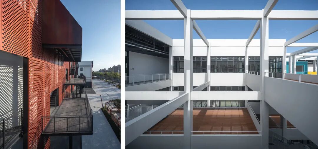 沪闵路的城市沿街界面作为园区对外展示的第一形象面,采用了强烈的构成手法来形成主要视觉形象,将沪闵路广场上的景观和路径倒映在厂房的立面之上,通过立面错落的平台与园区内部空间连通,在使用体验上增加了层次感和丰富性。园区沿街部分是大胆奔放的红,园区内部是冷静理智的白,一红一白,一深一浅,互相映照,互相衬托。