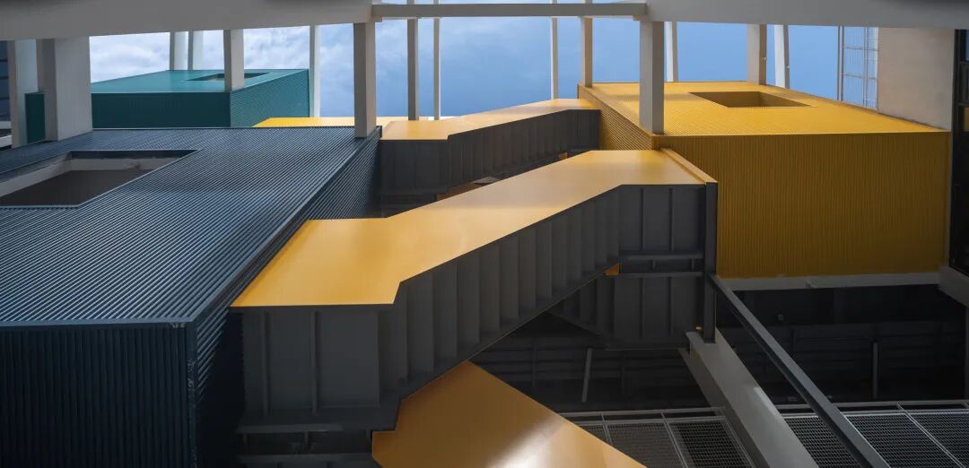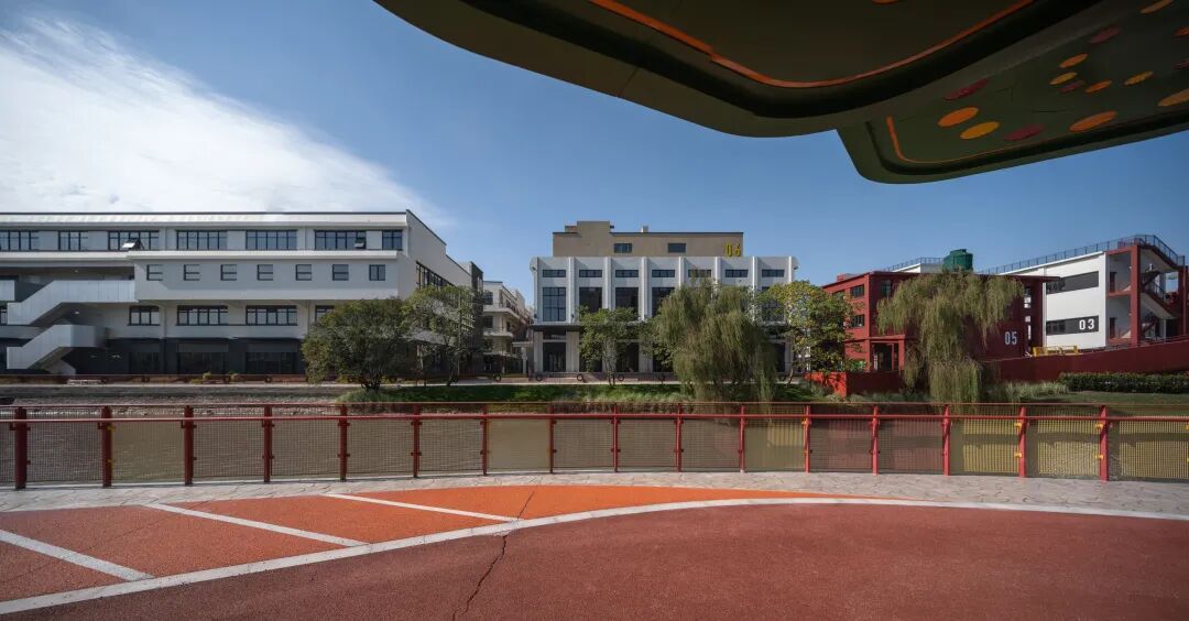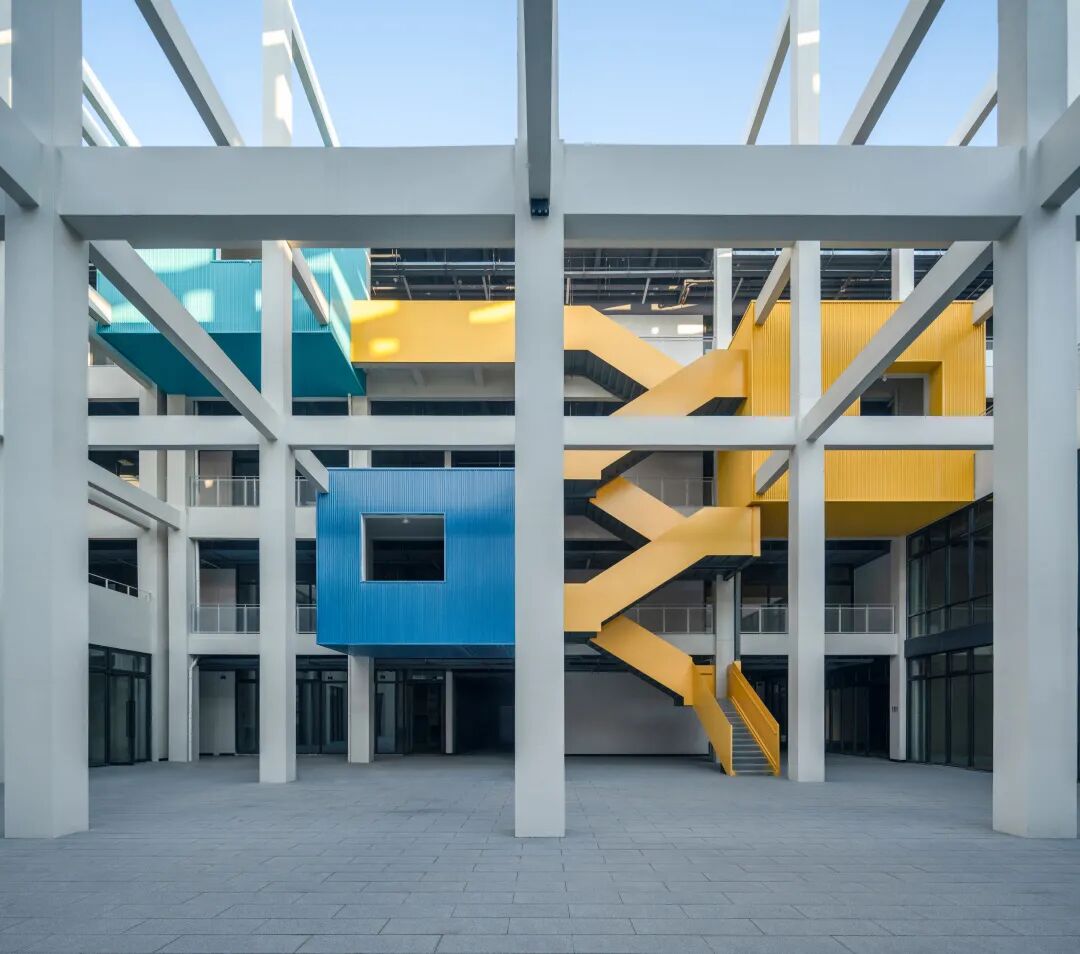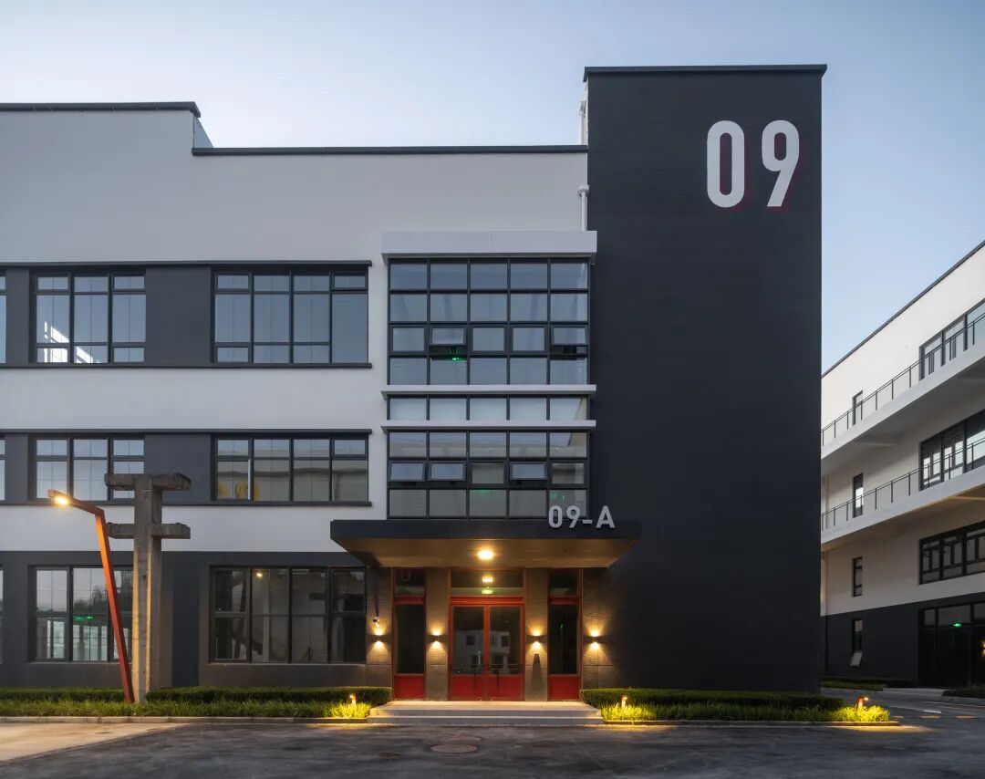 沪闵路的城市沿街界面作为园区对外展示的第一形象面,采用了强烈的构成手法来形成主要视觉形象,将沪闵路广场上的景观和路径倒映在厂房的立面之上,通过立面错落的平台与园区内部空间连通,在使用体验上增加了层次感和丰富性。园区沿街部分是大胆奔放的红,园区内部是冷静理智的白,一红一白,一深一浅,互相映照,互相衬托。