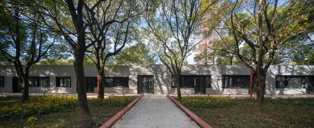 #402a和#502a的设计则结合现状保留的乔罐木进行设计,斑驳的树影投射在波纹铝型材和旋转的耐候钢板片墙上,产生出戏剧化的效果。#502a作为首先启动的首开展示区,室内设计也是采用了红黄蓝包豪斯主题色进行搭配,室外新增广告的旋转片墙,既是商业街入口的标志也是展区的宣传窗口。