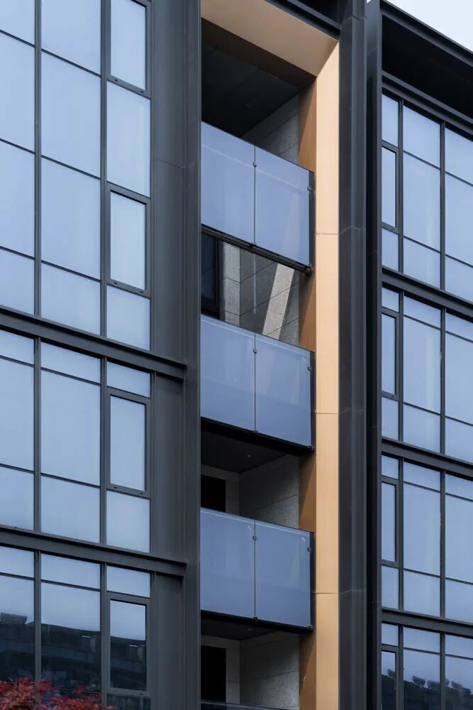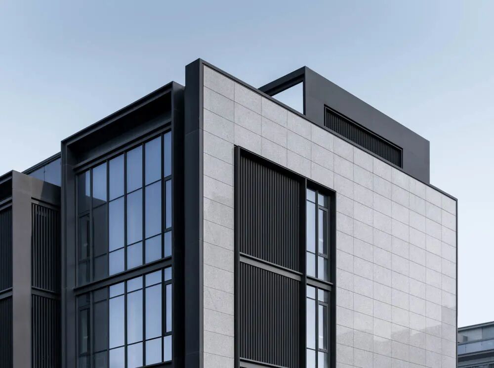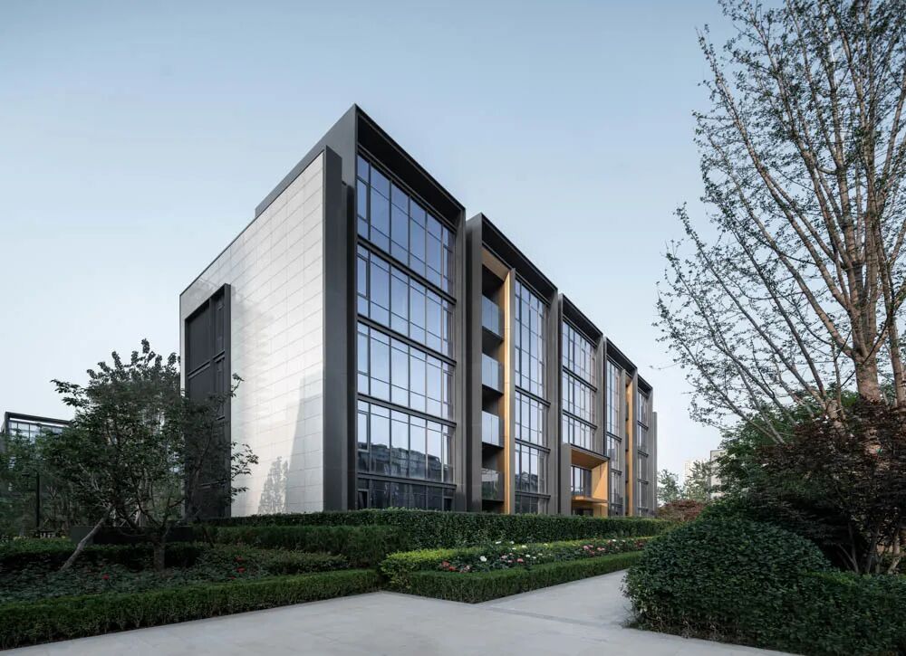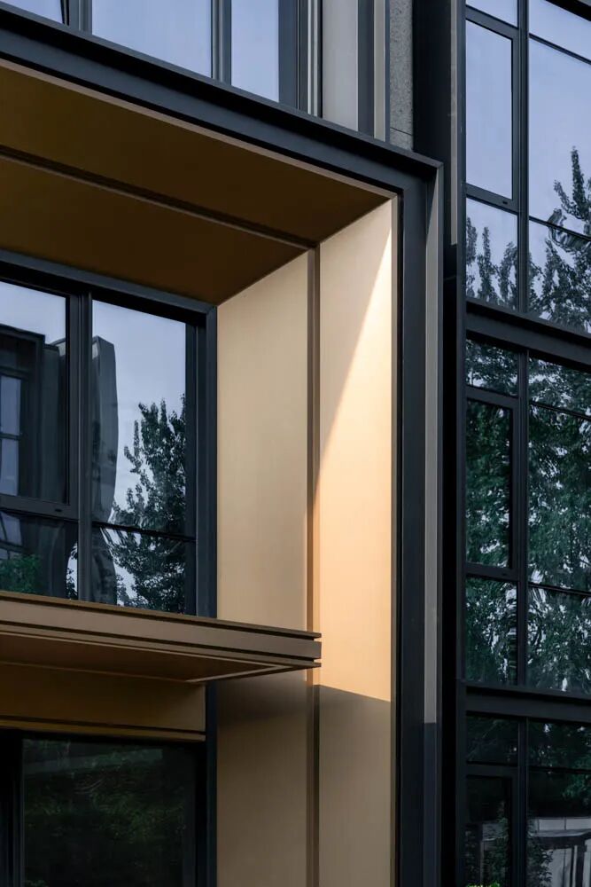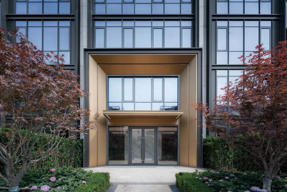 建筑主体色彩以冷色石材、灰色铝板和蓝灰色low-e中空玻璃,局部穿插了仿铜色铝板。建筑在山墙、窗间墙是用石材表达,其他部分均以铝板包裹玻璃的形式表达了建筑体量,每一道工序、每一处细节都以高标准设置,全方位展现都市豪宅的品质感。