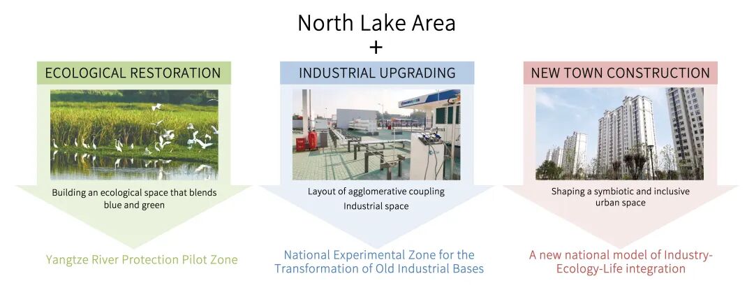 ▲发展策略:在长江大保护的国家战略背景下,聚焦“产业、生态、新城”三大维度,提出“北湖+”的空间发展策略。