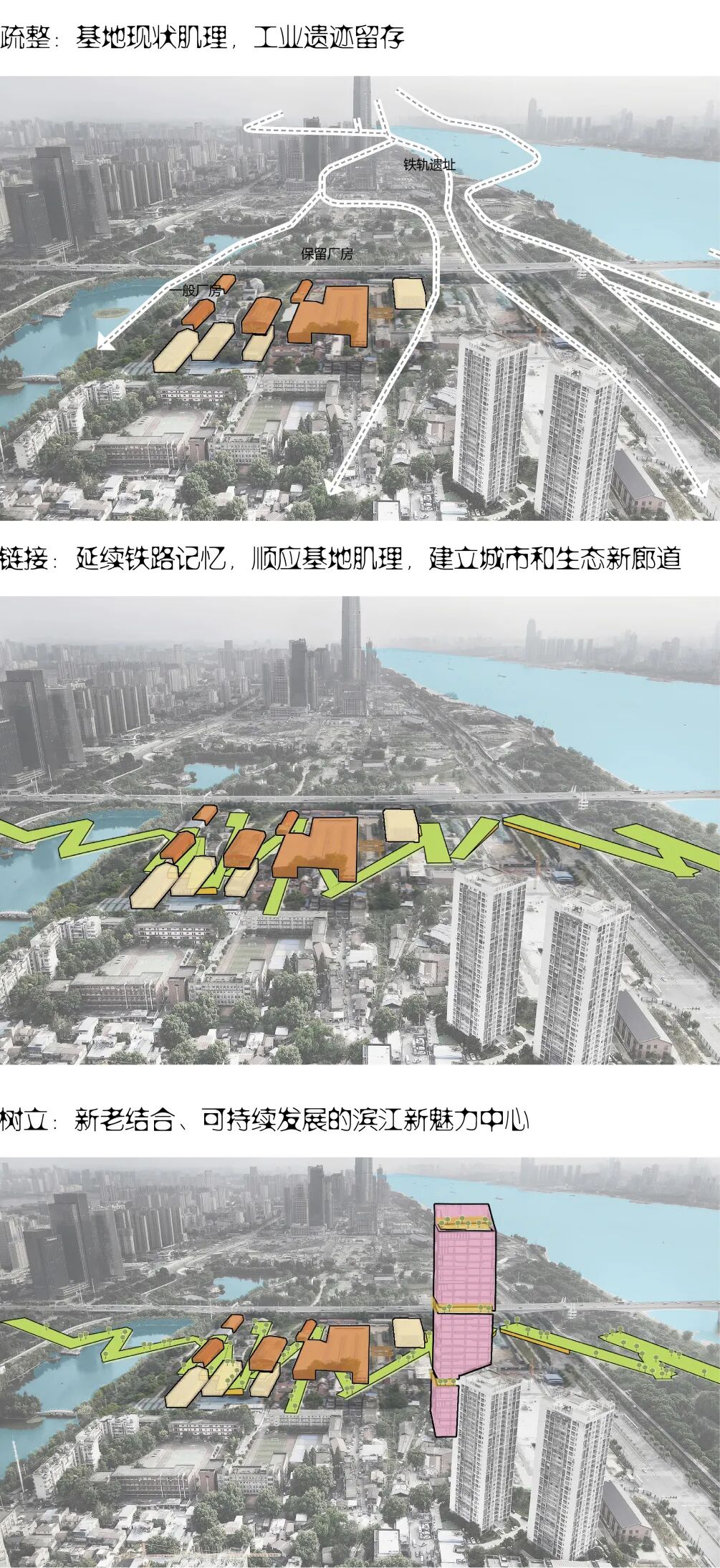 水石设计提出“超级链接”的总体概念,在充分保护历史遗存的基础上,链接城市记忆,链接江塘生态,引入新兴产业,重塑片区价值,激活城市孤岛,使地块从一代人的共同回忆链接成一座城的文化脉络,成为展示武汉城市形象的新窗口。