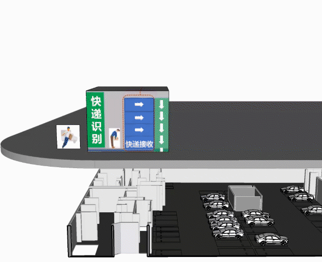 快递员扫码后,打开适合的箱体,进入后完成检索,自动传输至地下水平传输带,准备运输。