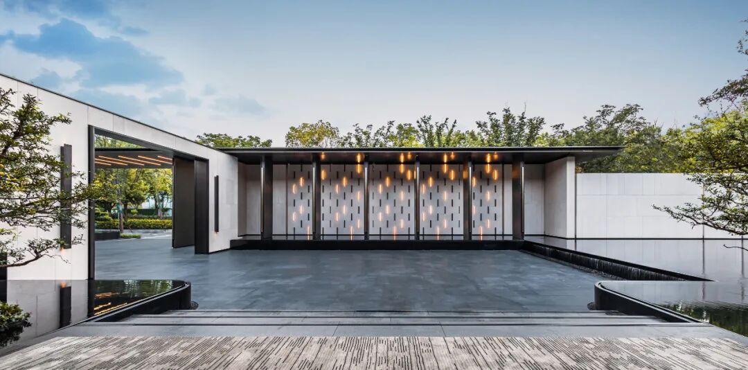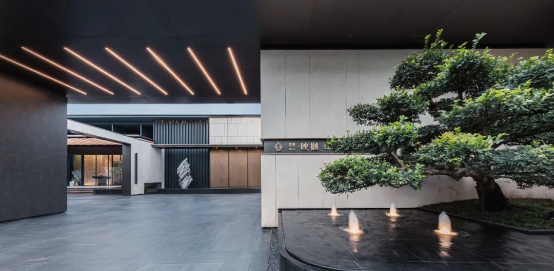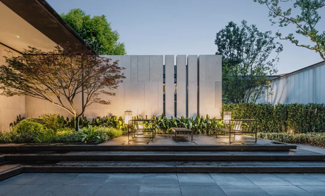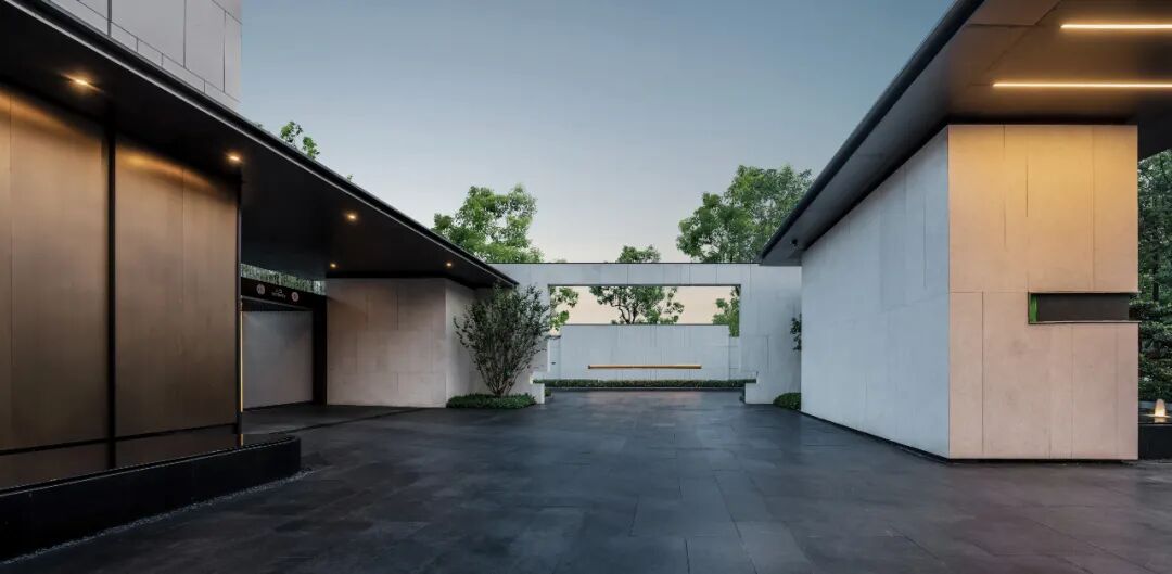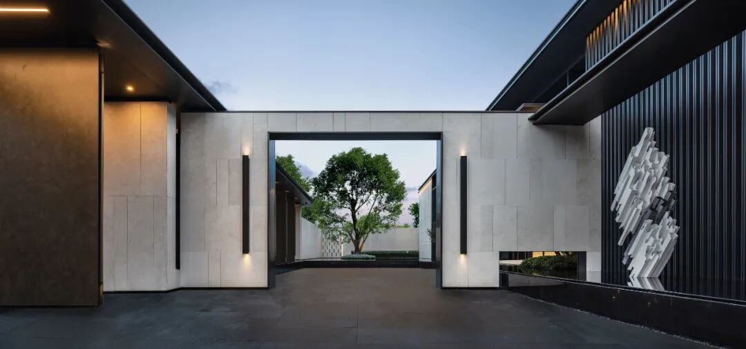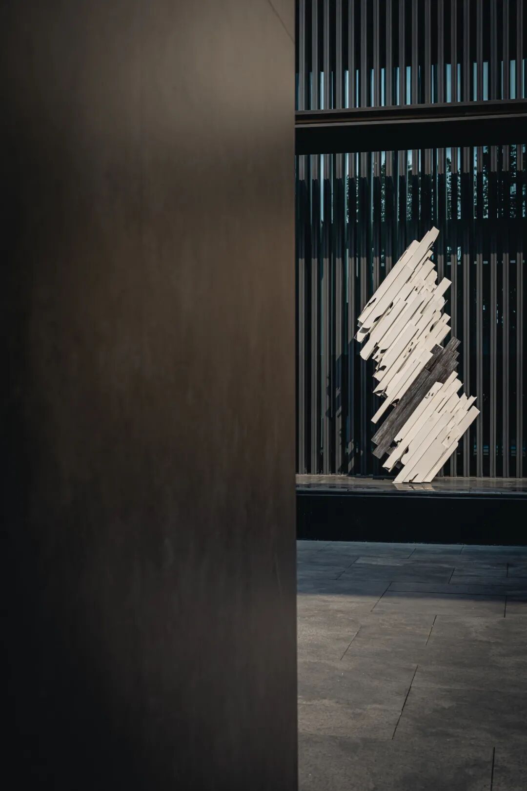 入口由陶瓷与原木穿插组合的景观雕塑伫立于静水之上,让人感知时光铭刻的痕迹。时间在流转,宁静而质朴的美却永久凝固在了一瞬间。