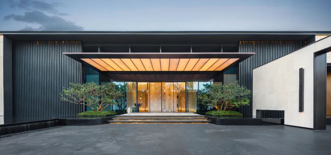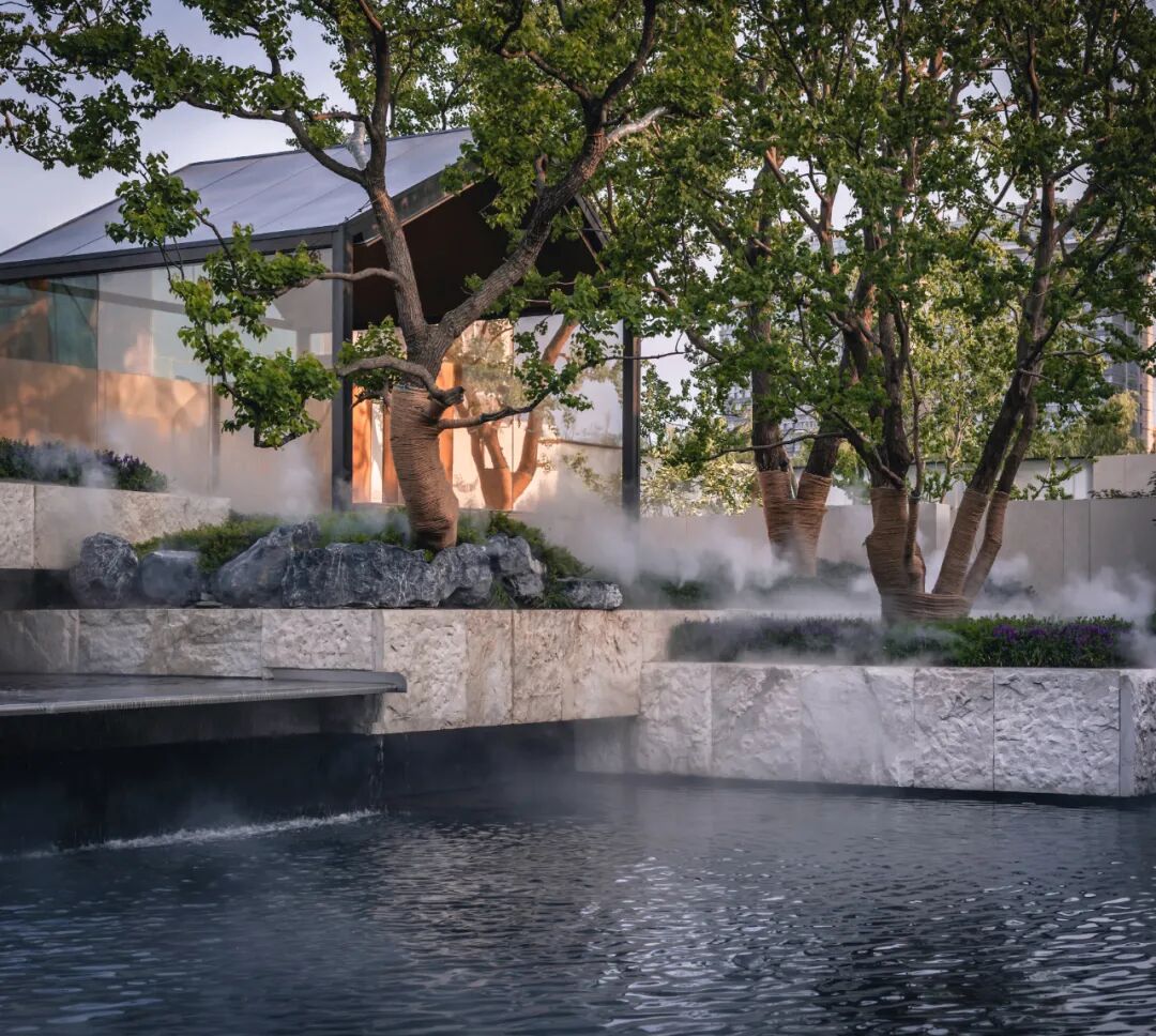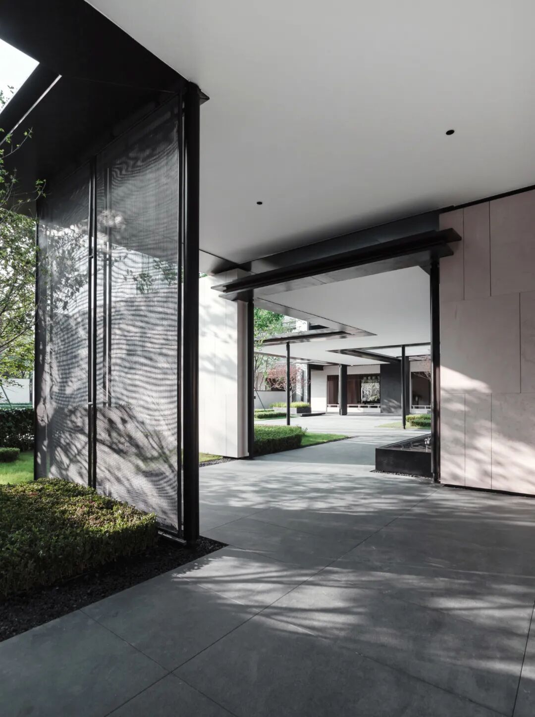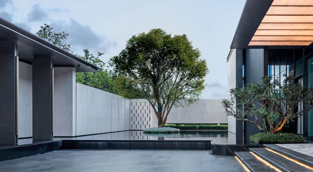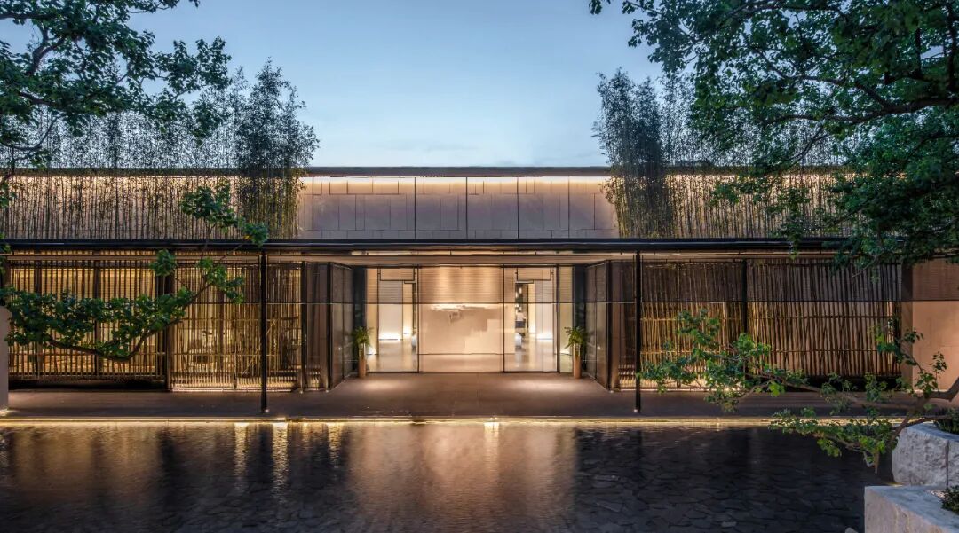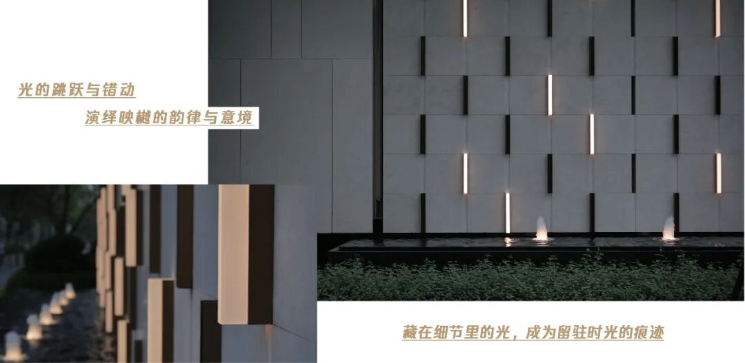 入口由陶瓷与原木穿插组合的景观雕塑伫立于静水之上,让人感知时光铭刻的痕迹。时间在流转,宁静而质朴的美却永久凝固在了一瞬间。