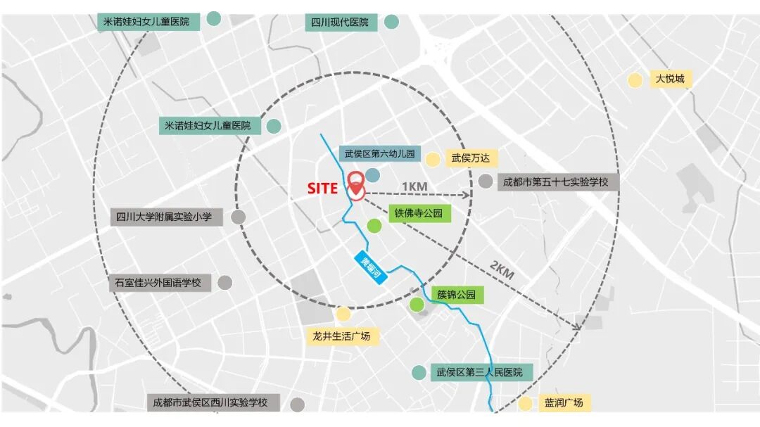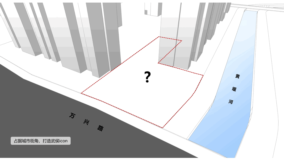 基地西侧黄堰河环绕,但周边已建成的小区及商业年份较久,颜色较重,需要用建筑点亮街角,同时基地空间较小,需要后退建筑扩大前场基地。设计师希望在此布置具有现代美学的建筑成为武侯ICON,因此本案取巴山蜀水之悠悠水韵、锦官城柏森森之林影之美,营造“水韵林影”的主题,用景观缝合城市缝隙,极具透明感的建筑物富有视觉冲击性,吸引人们的视线。