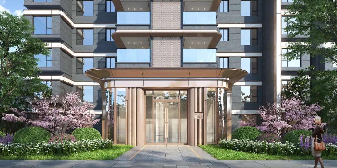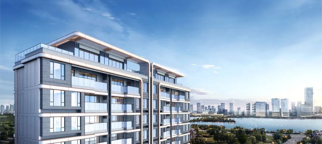 外立面设计上引用了藏山纳水的设计理念,传承东方艺术之美,框构中正,完成了古典美学的现代转译。形态上舍弃了住宅惯用的平直方正,采用弧形立面设计,将山的刚毅,与水的柔和完美演绎,刚柔并济,充满生命活力。