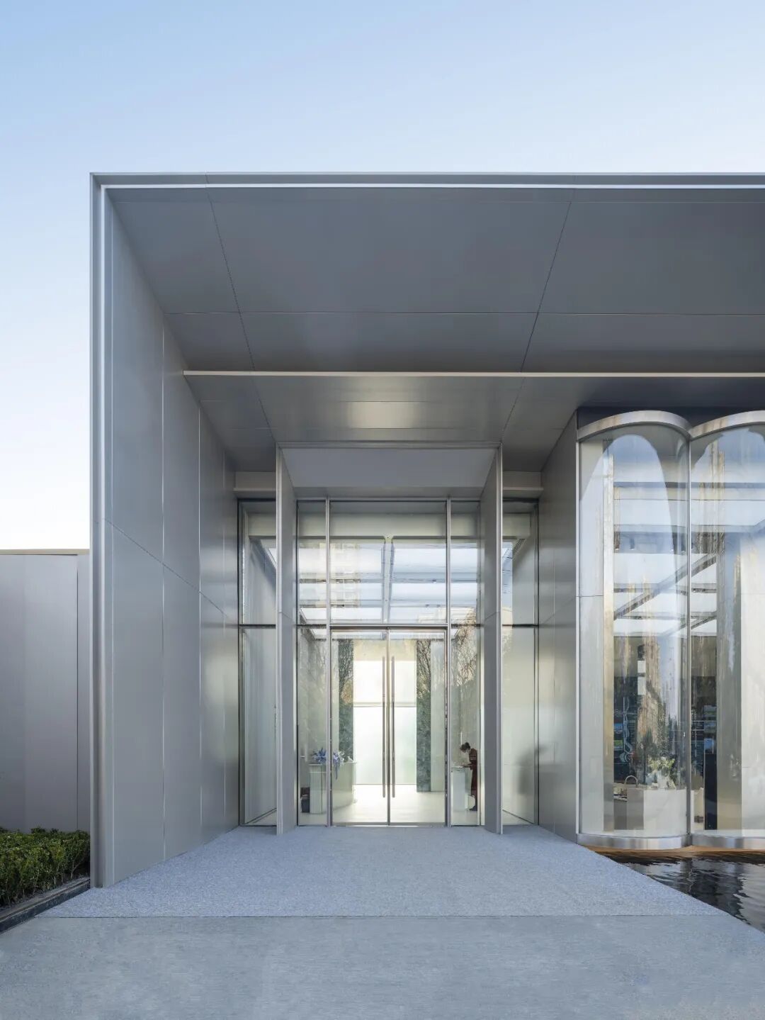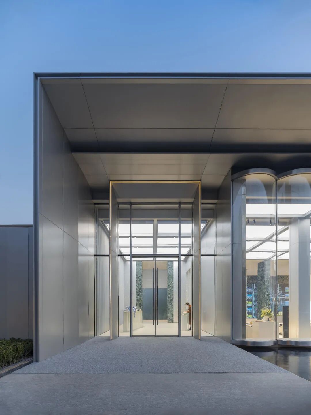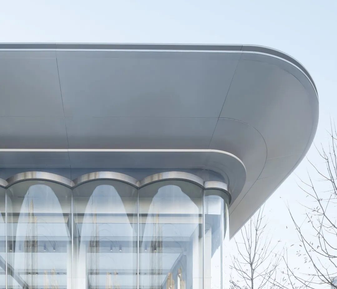 建筑立面,设计师采用铝板密缝拼接的方式,避免胶缝影响整体品质,精工匠筑的细节是建筑造型简约而不简单的保证。