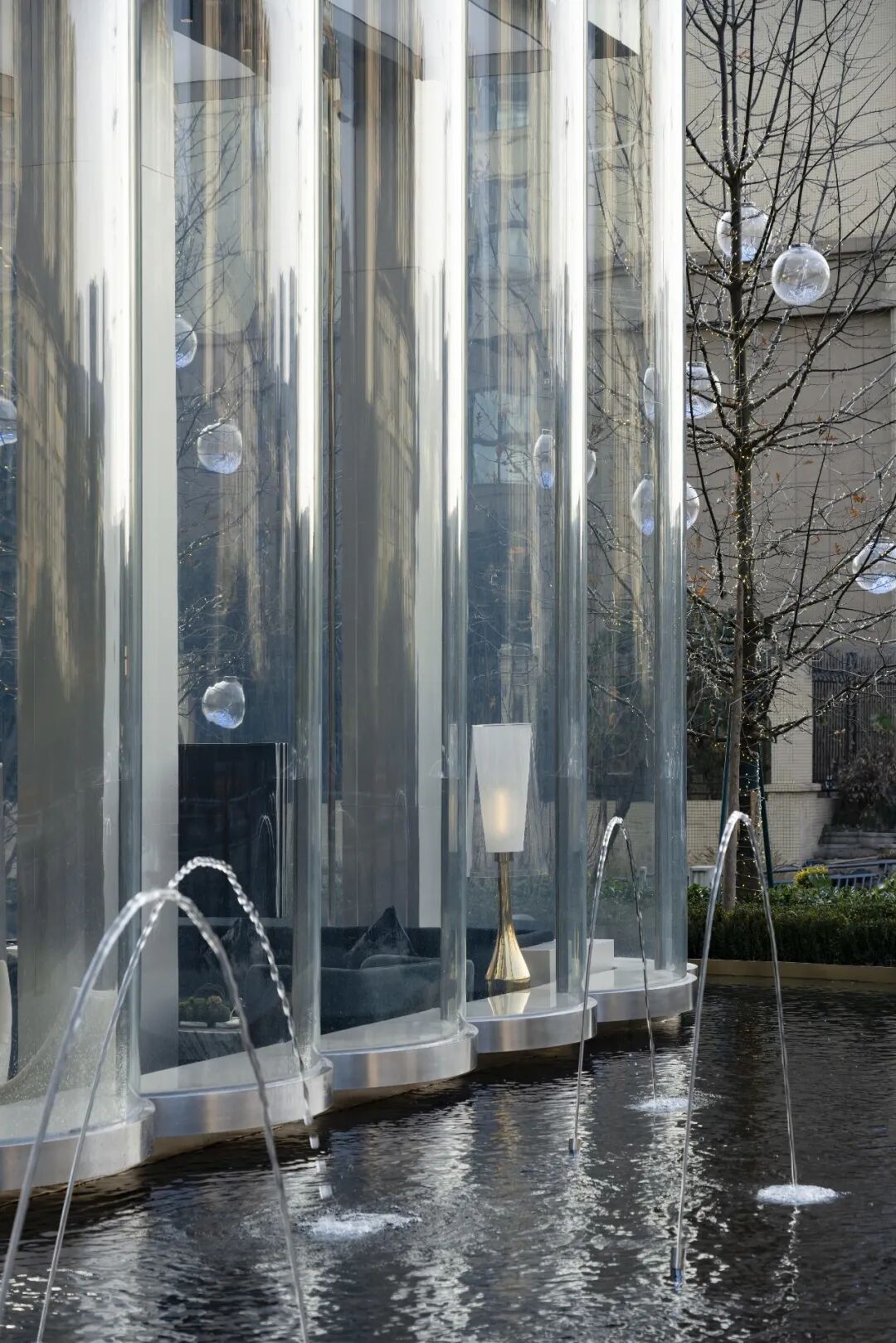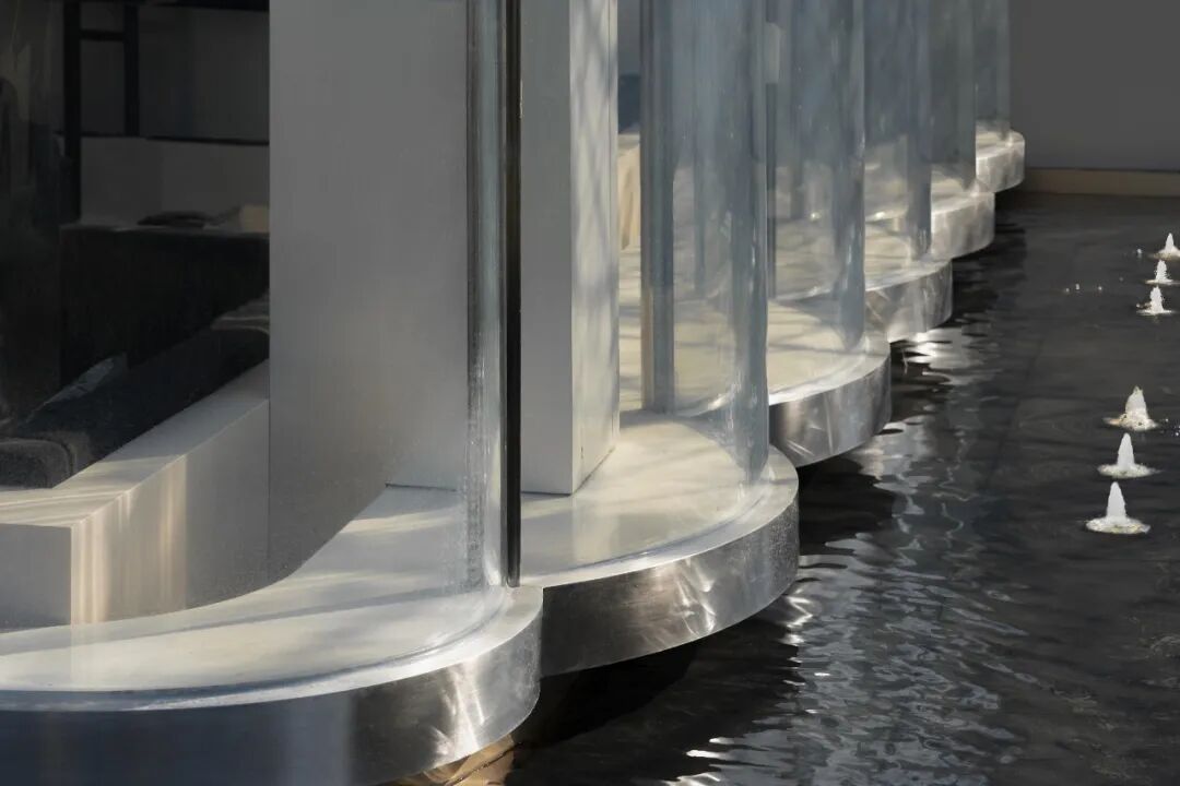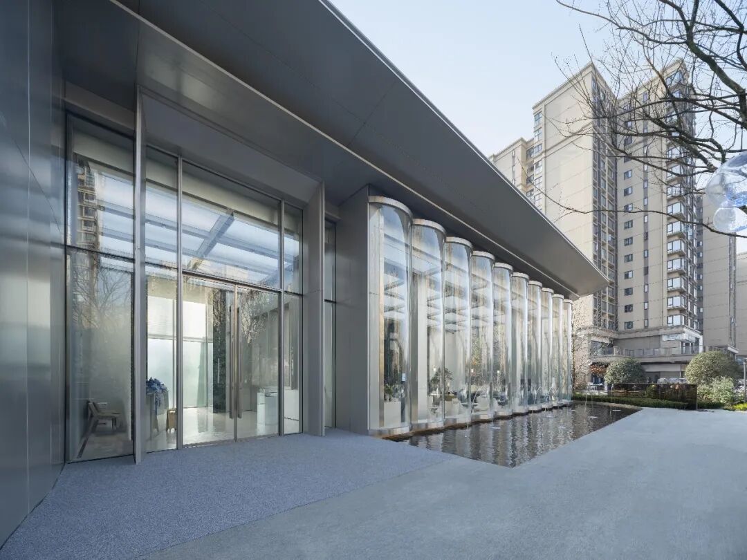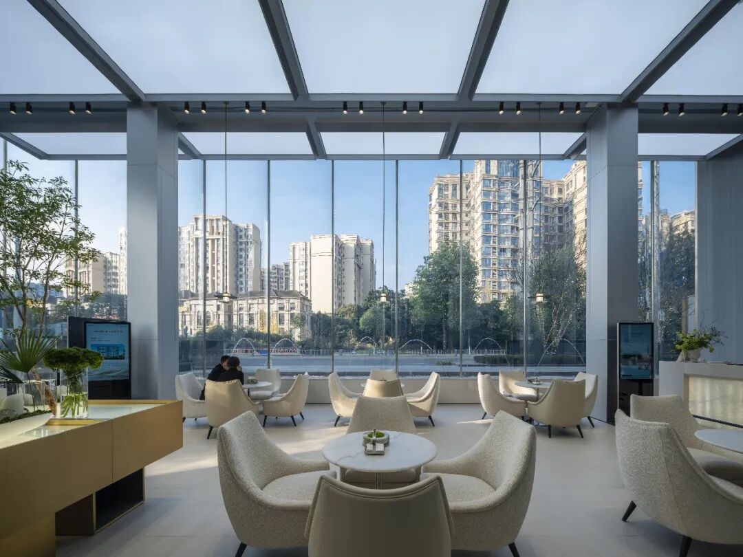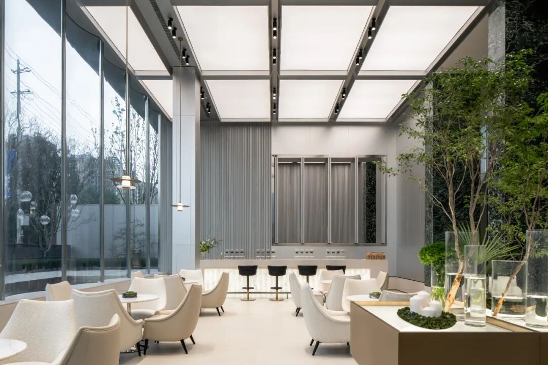 建筑前场萦萦碧波,水林相映成趣,增添建筑的漂浮感,而后到达城市会客厅共享空间,透过晶莹的弧形造型玻璃,映入眼帘的是花影林迹的唯美空间。