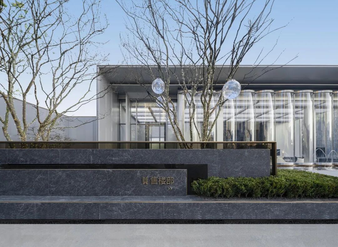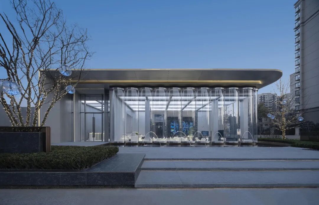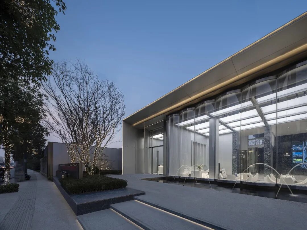 展示中心采用现代极简美学的风格,弧形的弯钢玻璃形成晶莹剔透的幕墙结合铝板飘顶,形态简洁大方而不失灵动。