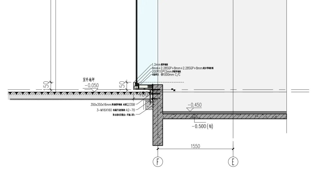 本案主要立面由16块5.7m高,1.6m宽的无肋自承重的弯钢玻璃组成,由于造价高和工艺难的特点,是十分罕有的立面材料。既有超白玻高透的特性,又随着弯弧形成视觉上阵列的反射,使得展示中心立面品质提升。