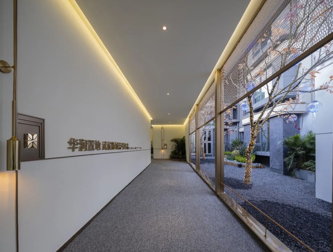 移步展示中心,访客进入到廊影林趣的现代雅致空间。行云流水的连廊空间,带来步移景异的景致,廊下光影成趣,内庭树影斑驳,体现了出则繁华,入则宁静的大宅气质。