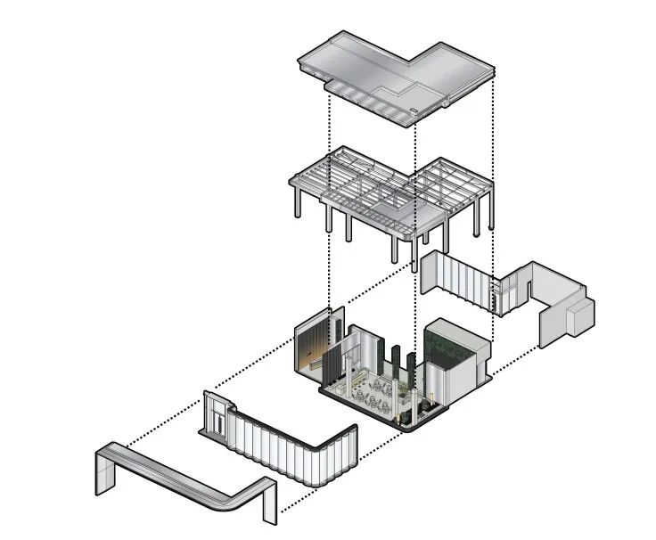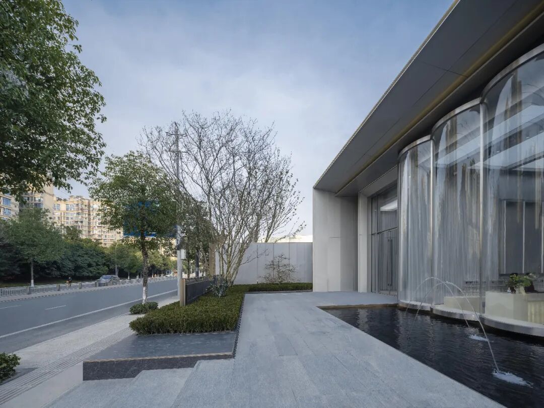 建筑以L形体量占据城市街角,尽可能扩大展示面。洽谈区位于景观最优处,室内局部下沉的处理手法,增强了空间限定感,也让洽谈区临水一侧更亲水。