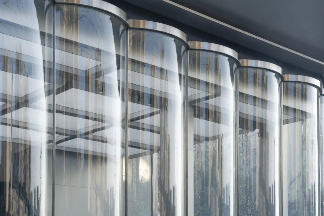 玻璃幕墙使建筑具有了透明性和轻盈感,弯钢玻璃的出现满足了现代美学对于作品的更高要求,其光滑的流线型实现了从平面幕墙到弧面玻璃幕墙的完美过渡,使玻璃幕墙运用于建筑更具圆滑平整,自然良好的整体感。