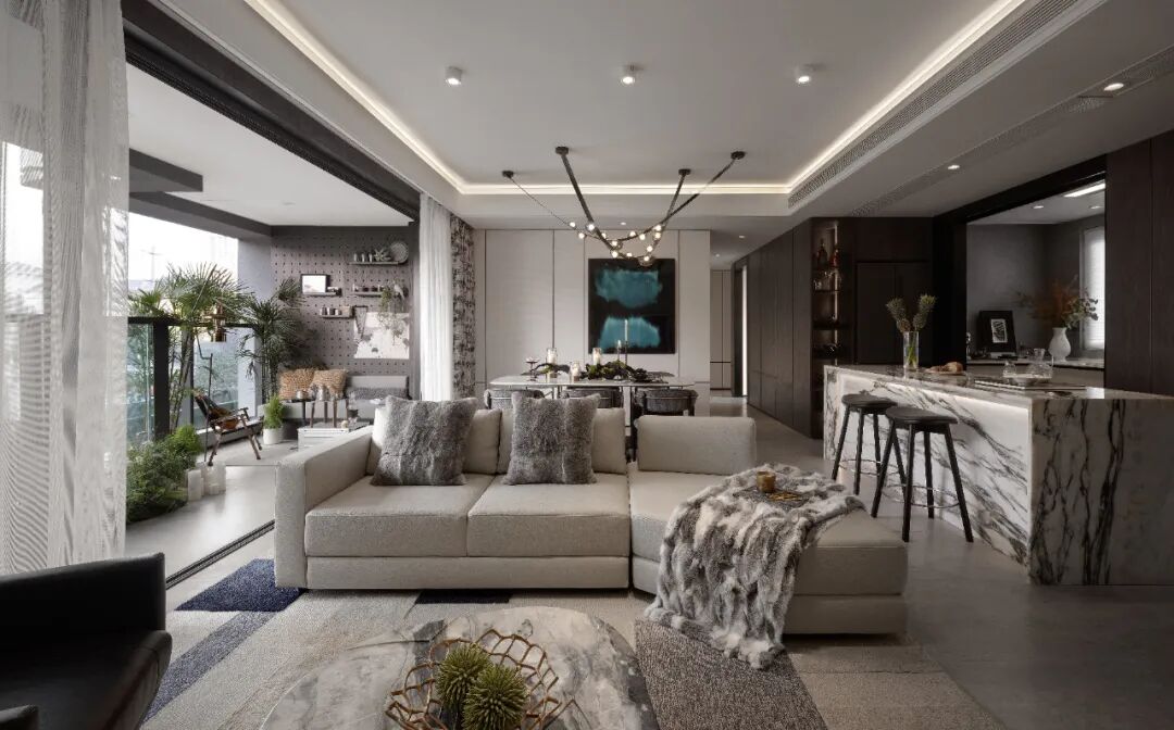 客餐厨空间设计,布局开放,洄游动线更符合业主对功能化和社交互动的双重需求,避免由隔断产生的空间逼仄感。通过开放式的空间设计,重新编排生活功能,提高家人间的互动性。